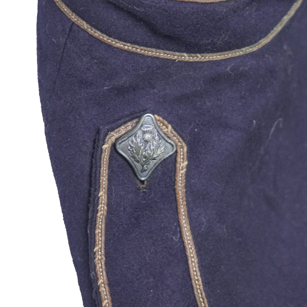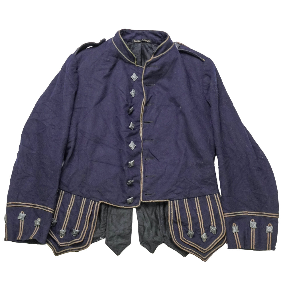 Scottish military piper or drummer tunic in traditional dress style. Structured wool-blend outer with decorative front detailing and shoulder accents typical of band or ceremonial uniforms.