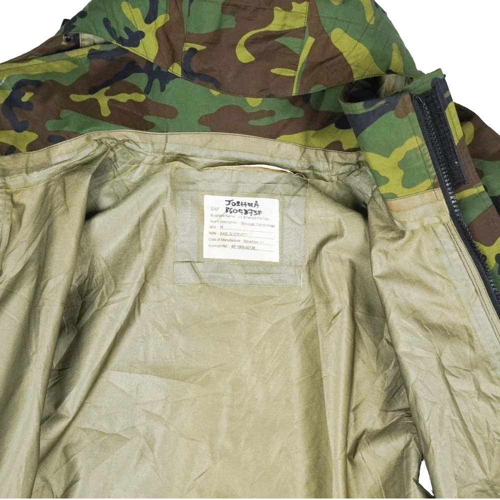 Surplus Singaporean camouflage Gore-Tex jacket. Waterproof shell construction with seam-taped panels and a zip front closure.