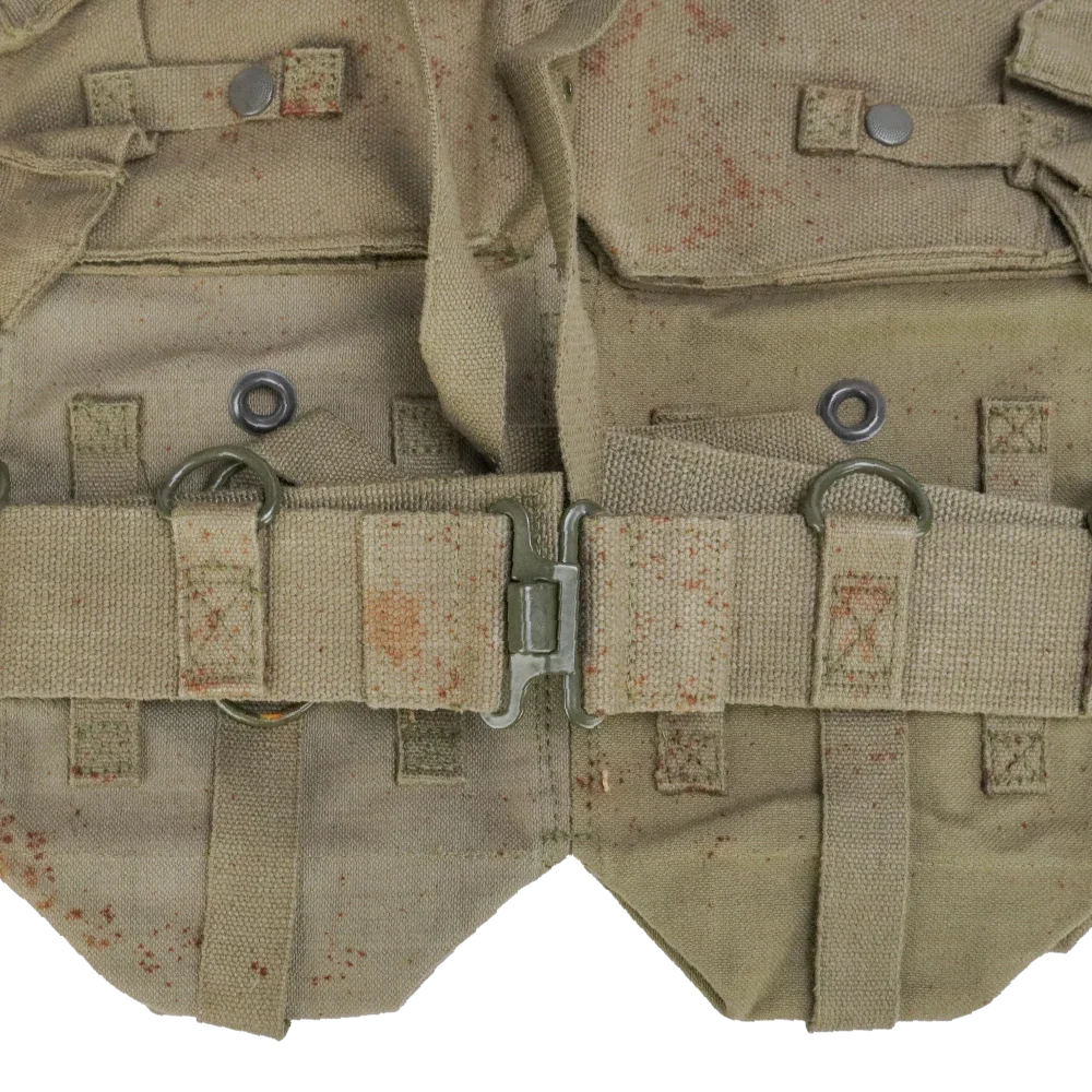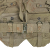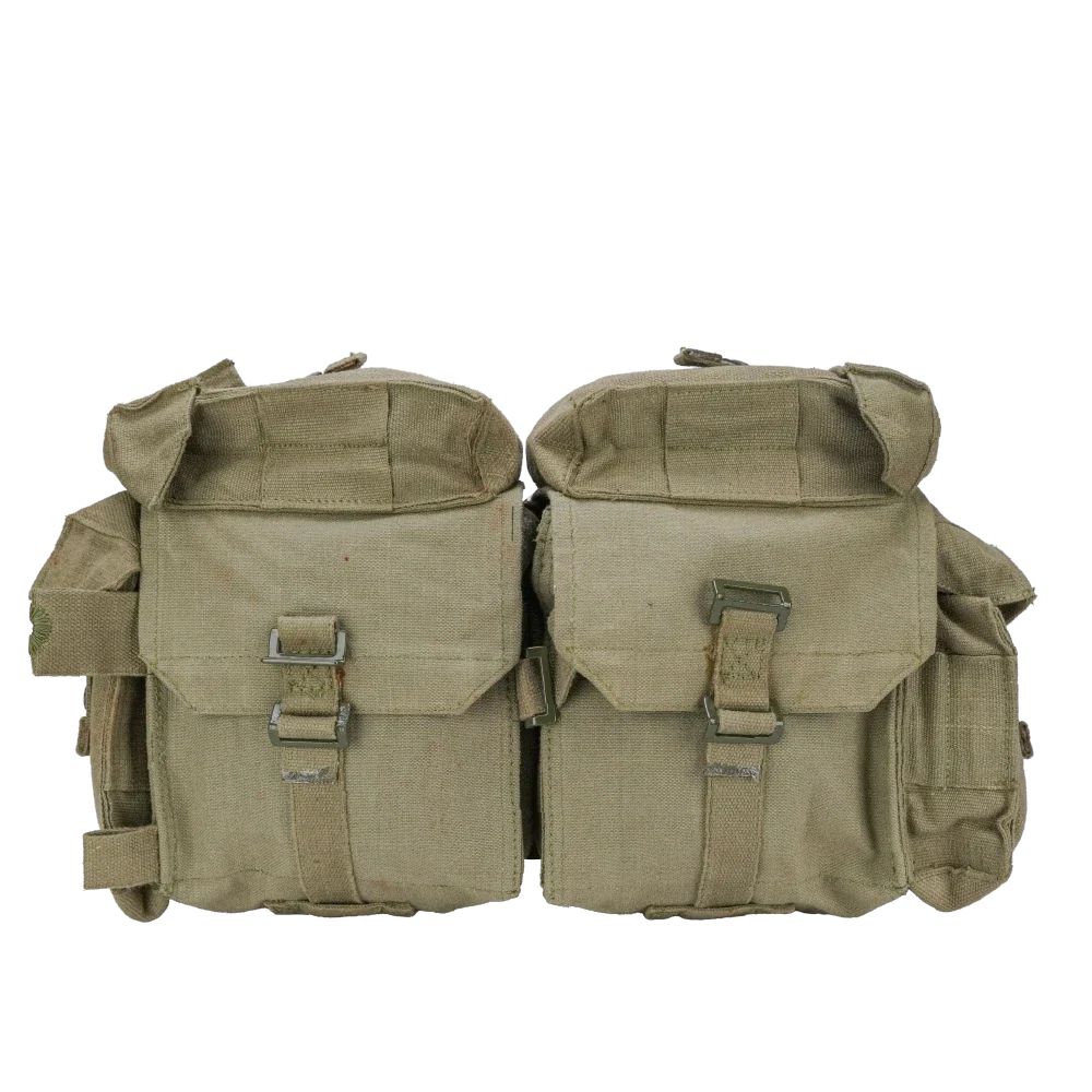 South African Pattern 70 kidney pouch set in khaki cotton canvas. Heavyweight construction with solid metal hardware. Includes belt, four double FAL magazine pouches, and two large kidney pouches.