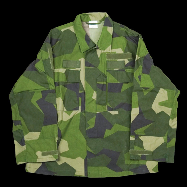 Swedish M90 camouflage field shirt in surplus issue configuration. The shirt features reinforced elbow areas, a shrouded button-up front, and hook and loop chest pockets. Hook and loop panels are present on the upper right arm and left chest, with adjustable cuffs.