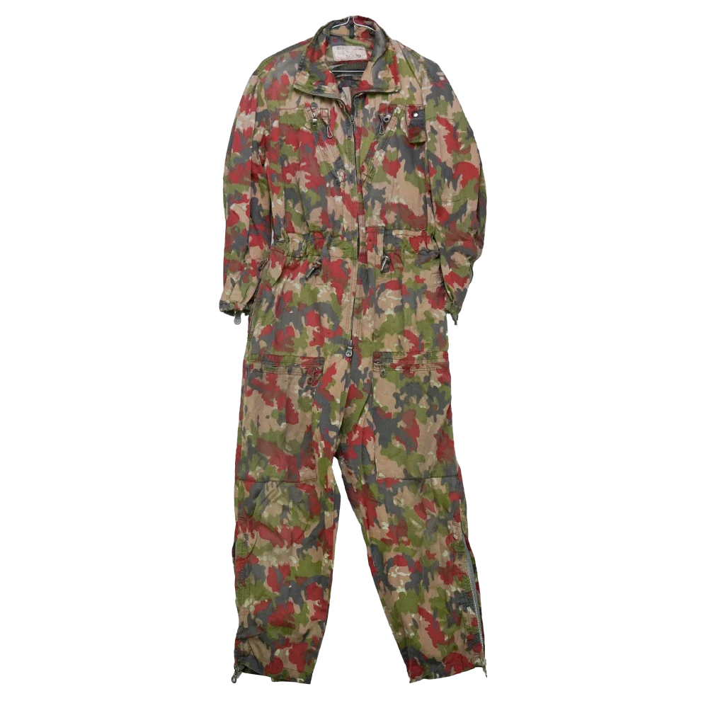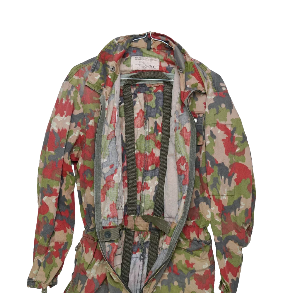 Swiss surplus tanker coveralls in Alpenflage camouflage. One-piece construction combining jacket and trousers in a single garment.