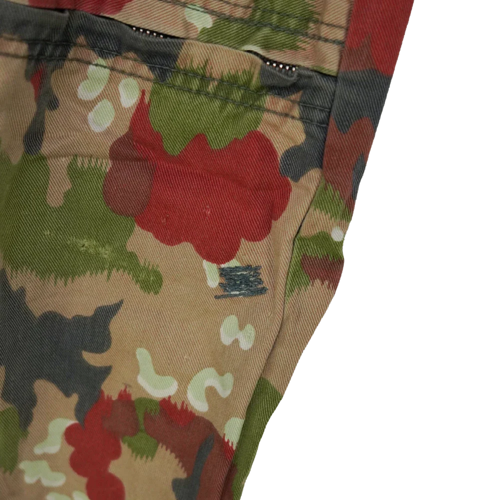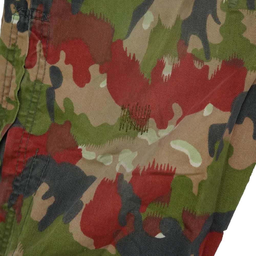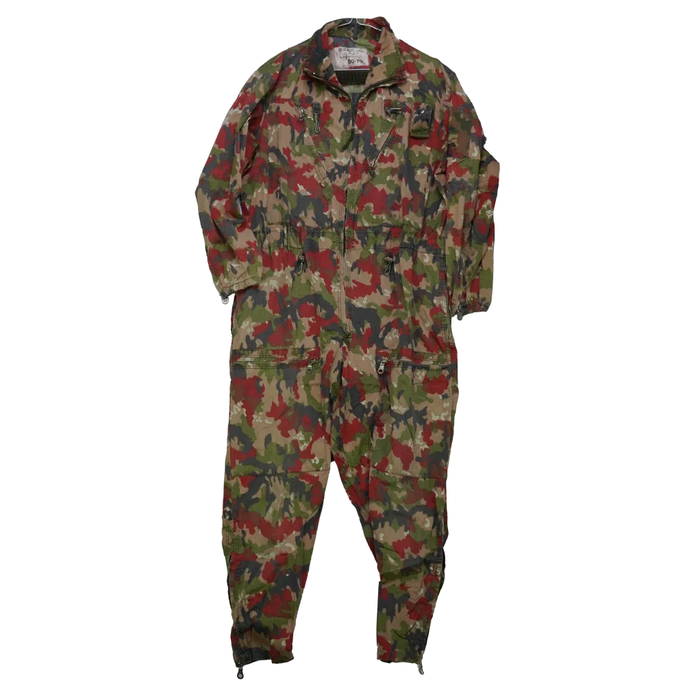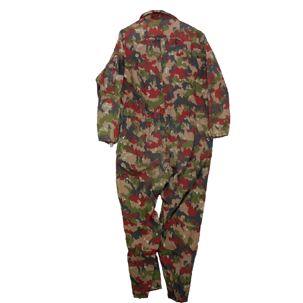 Swiss surplus tanker coveralls in Alpenflage camouflage. Full-body one-piece construction with front closure and integrated leg and sleeve coverage.