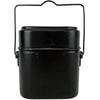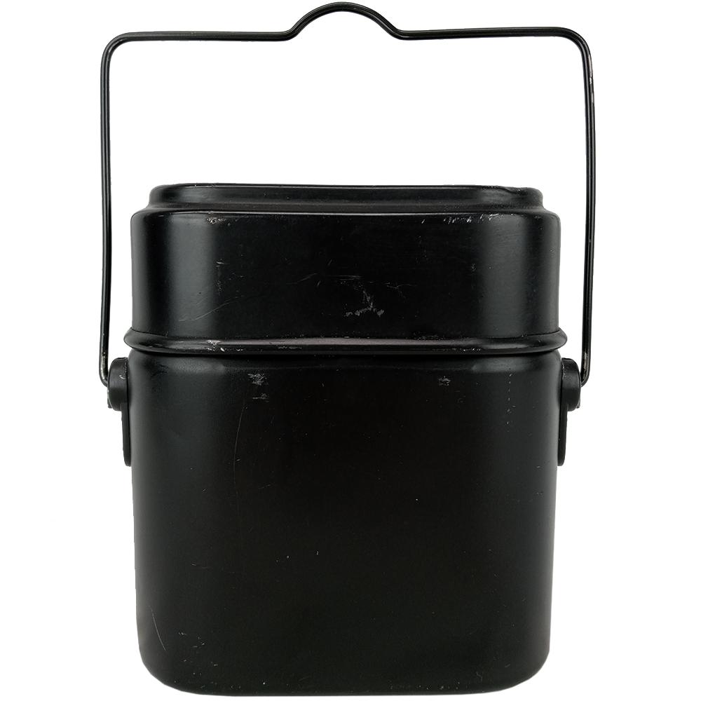 The Germans seem to have set a standard as their southern Swiss counterpart have copied their successful design. The mess kit breaks down into 3 parts and the locking handle becomes a convenient carrying handle for the lid. Another similar sized tin slots into the large main section providing 3 different vessels for cooking. All used sustenance components are display/prop/collectable only and not for consumption use.