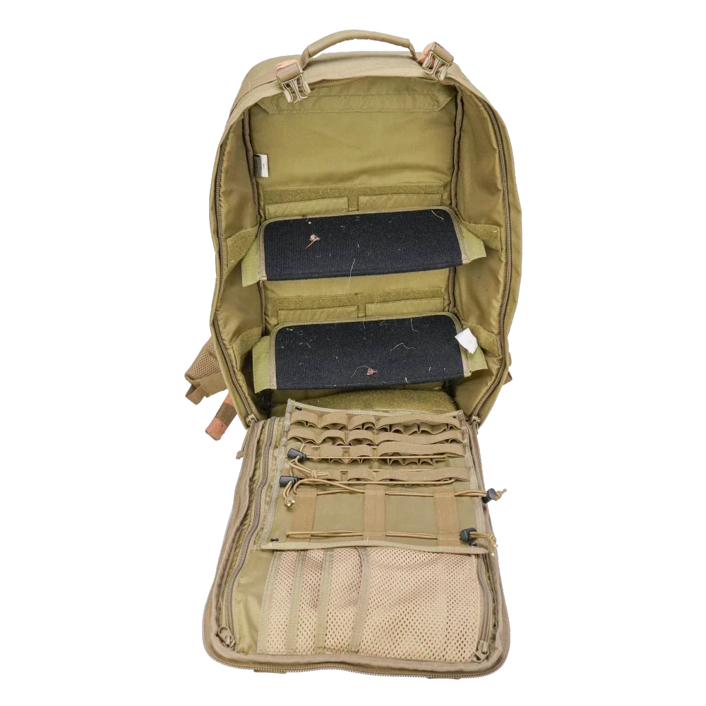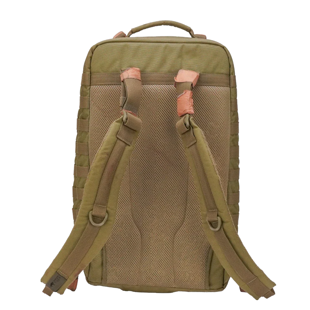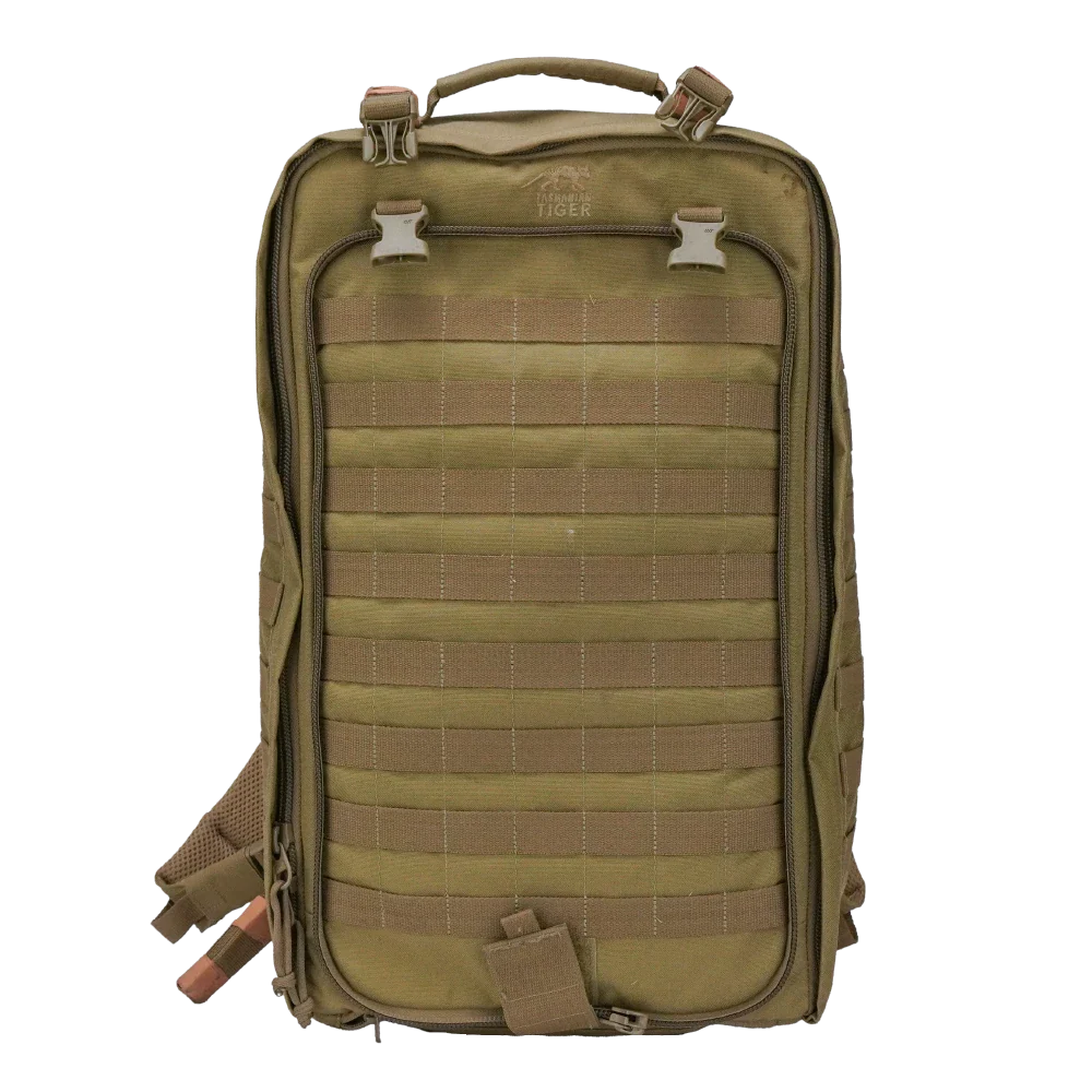 Tasmanian Tiger First Responder Move On rucksack in coyote. Commercial pack in used/very good condition, weighing approximately 2.6kg. Constructed from heavy-duty synthetic fabric with reinforced stitching and webbing throughout.