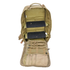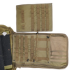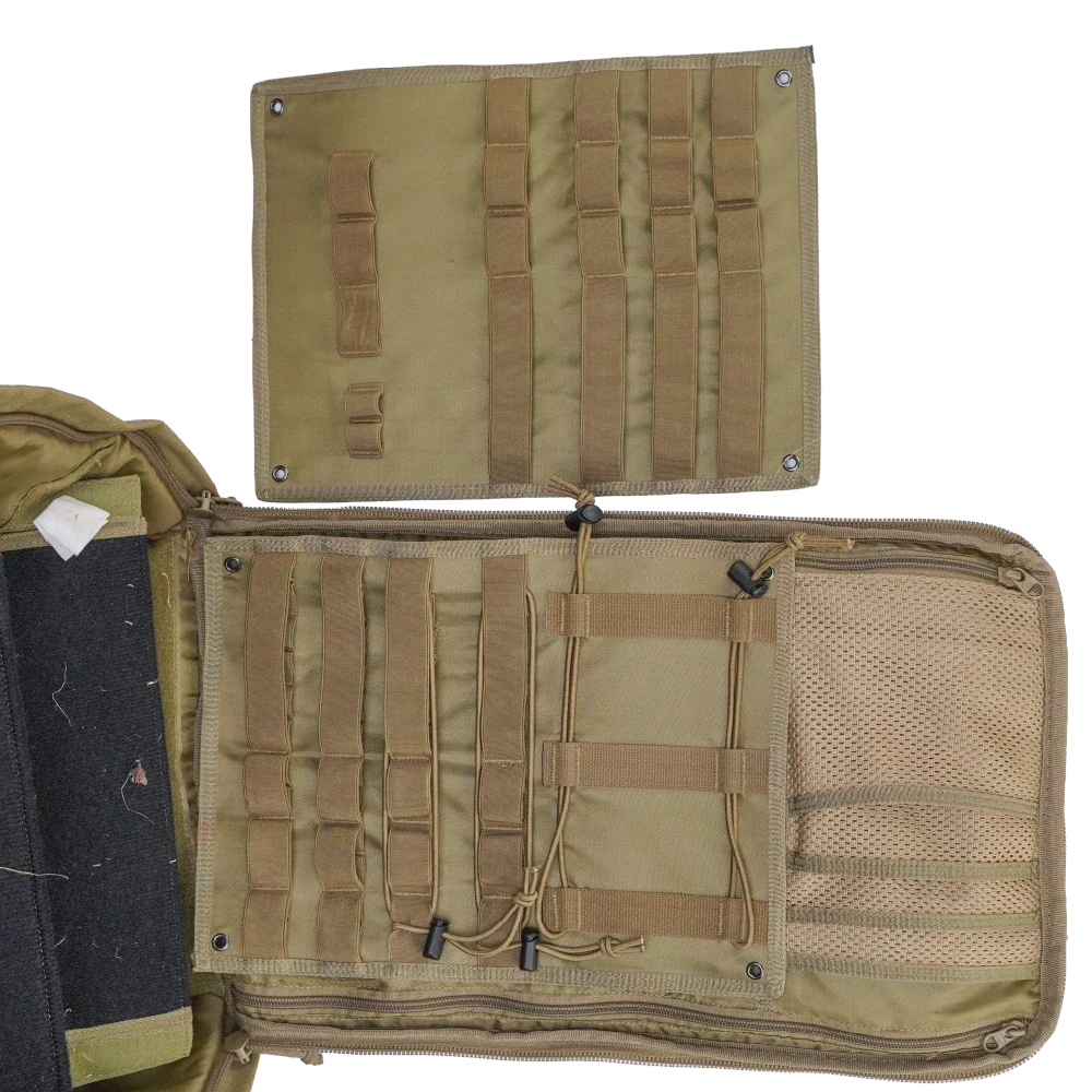 Clamshell zip opening with internal modular panels, elastic retention cords, and mesh zip compartments. Exterior features full MOLLE/PALS webbing on the front and sides, padded mesh back panel, adjustable shoulder straps, and a reinforced top carry handle.