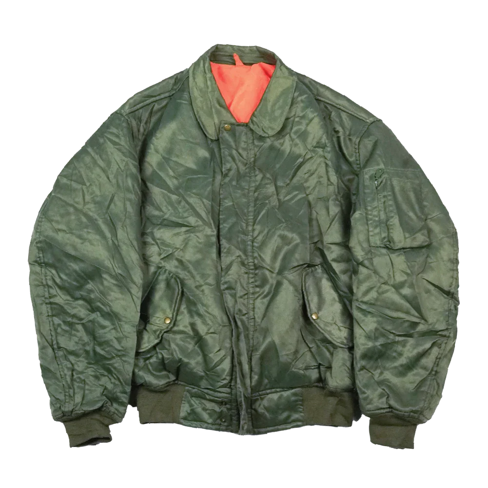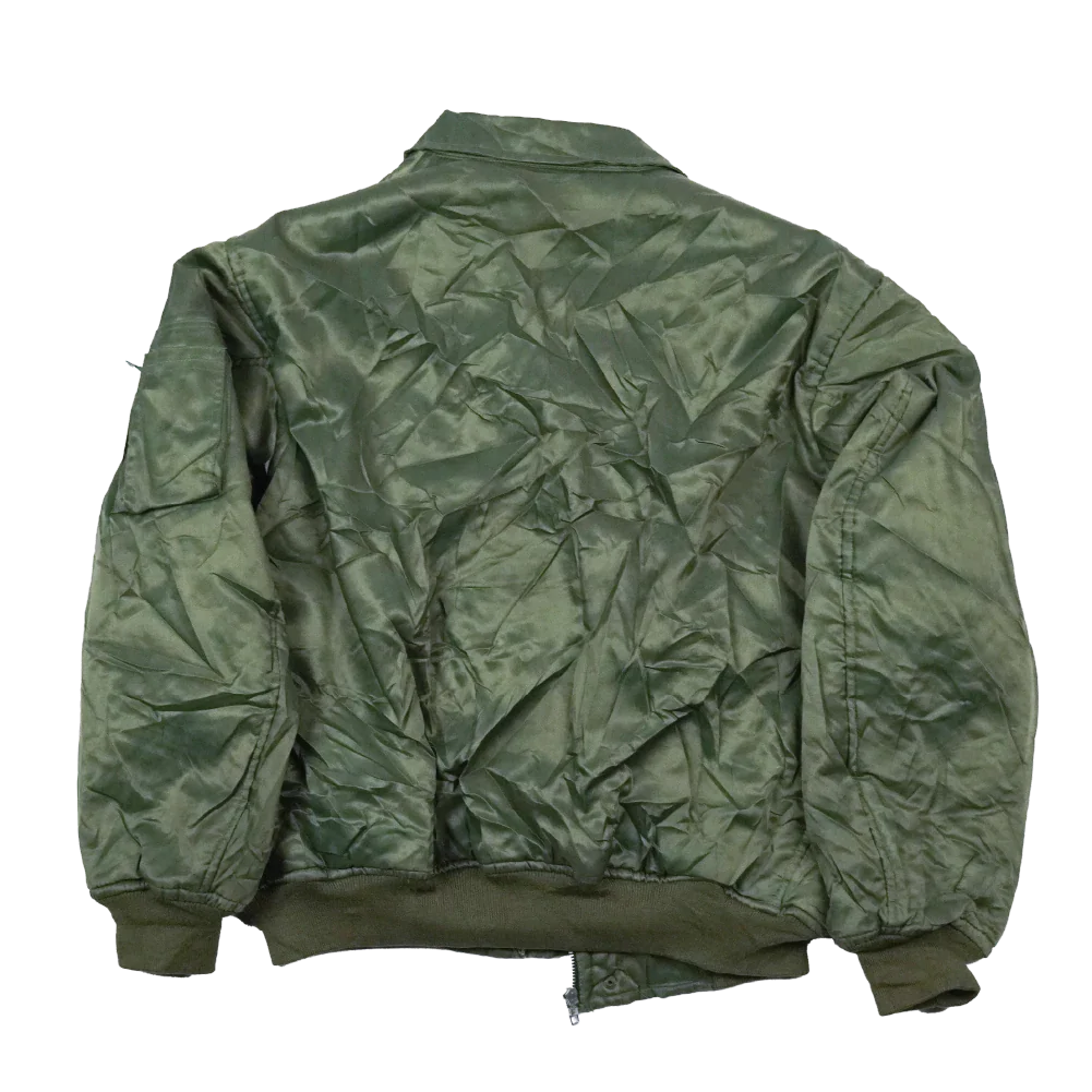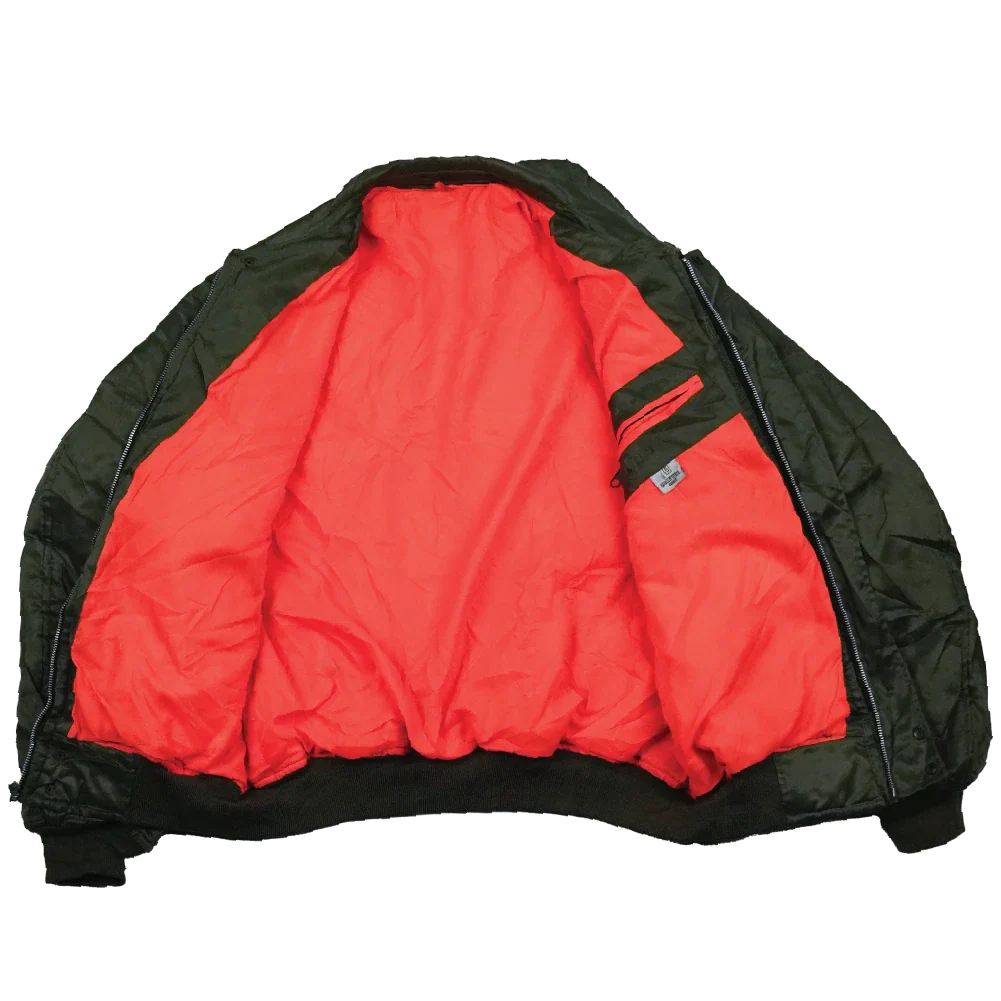 Commercial Turkish MA-1 style flight jacket in olive. Constructed from nylon and polyester, with elasticated cuffs and waist for a close fit and dome-fastened waist pockets.