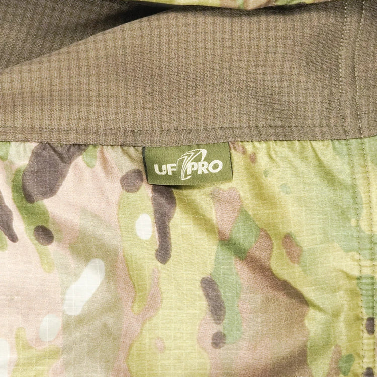 Commercial UF Pro Gen. 1 Hunter Jacket in Multicam pattern. This jacket features a thermal design with moisture-wicking fabric, a quarter-zip front, and a high collar. Elasticated cuffs and zip-closure sleeve pockets are present.