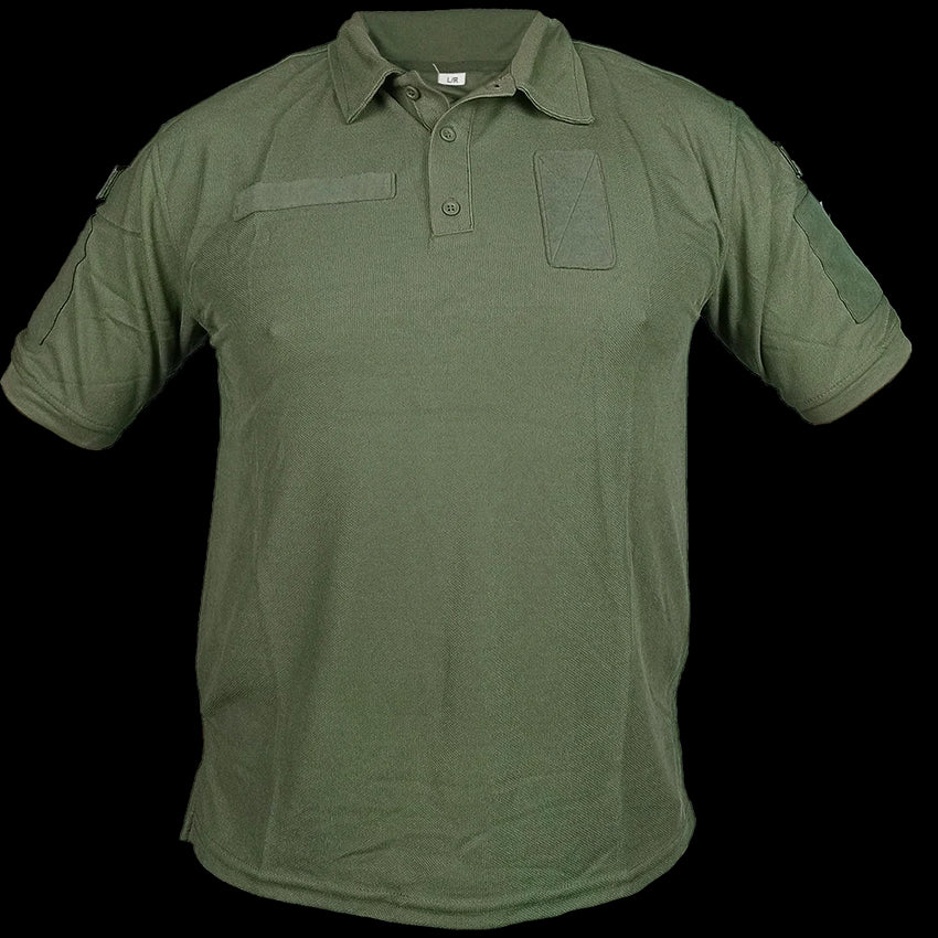 Olive drab Ukrainian Army short-sleeve polo shirt. Constructed from durable, breathable fabric, it combines comfort with a smart, professional look. Worn by service members for training and casual duty, it reflects national pride and military identity in a versatile design. Some might have national flag patches on each sleeve.