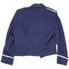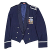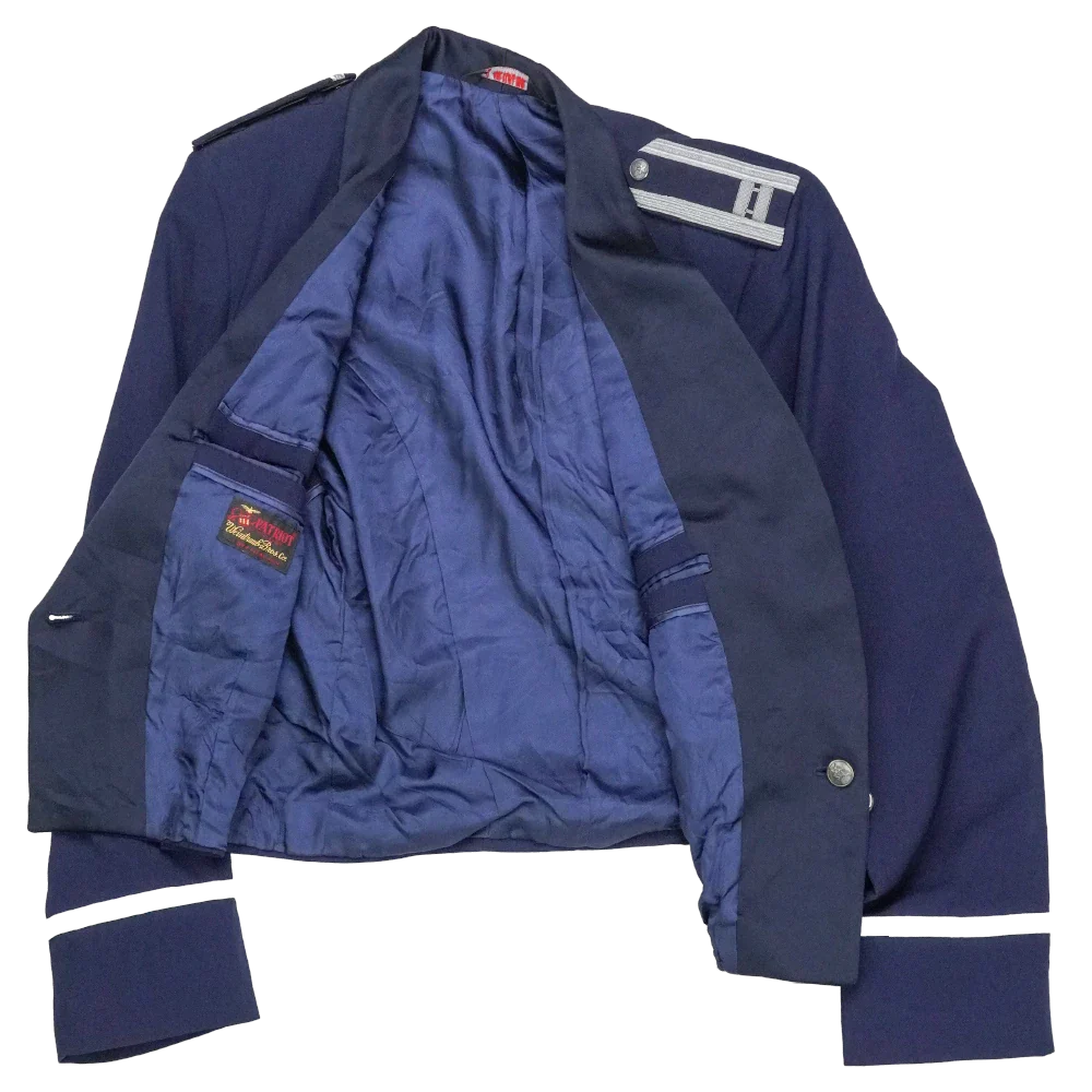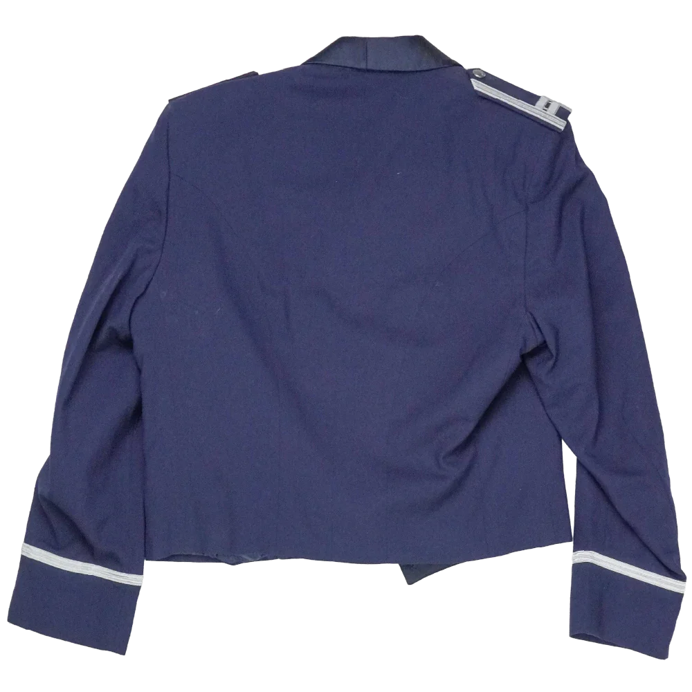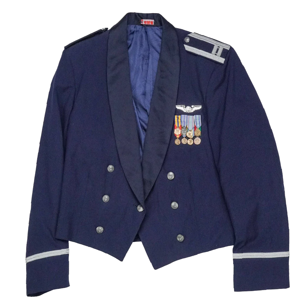 US Air Force mess dress jacket with Captain rank insignia. Dark blue formal jacket with a cropped waist-length cut, featuring a satin shawl-style lapel and double-breasted front with metal buttons.