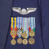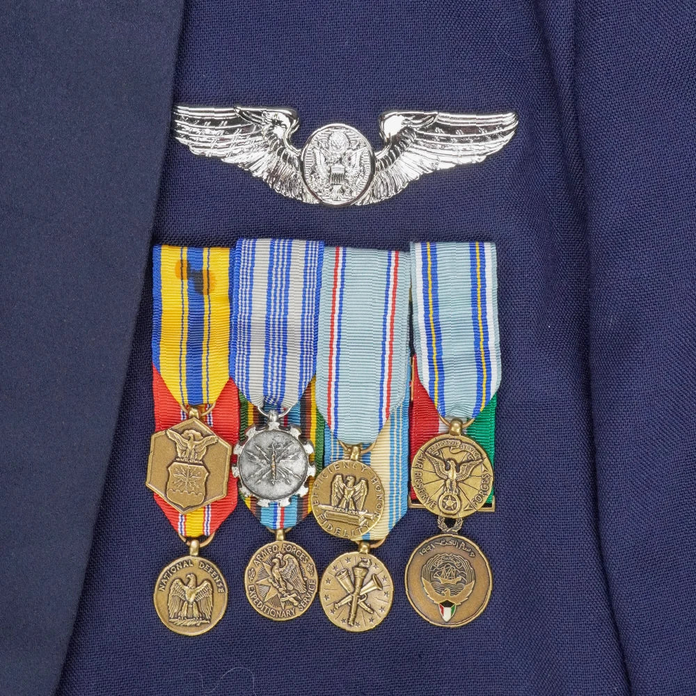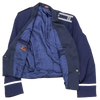 Fully lined interior with internal pocket and stitched size label. Includes shoulder epaulettes with rank slides, sleeve braid detailing, and mounted ribbon bar with aviation badge.