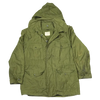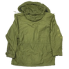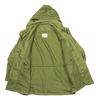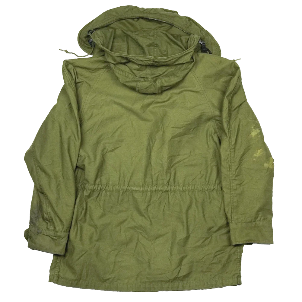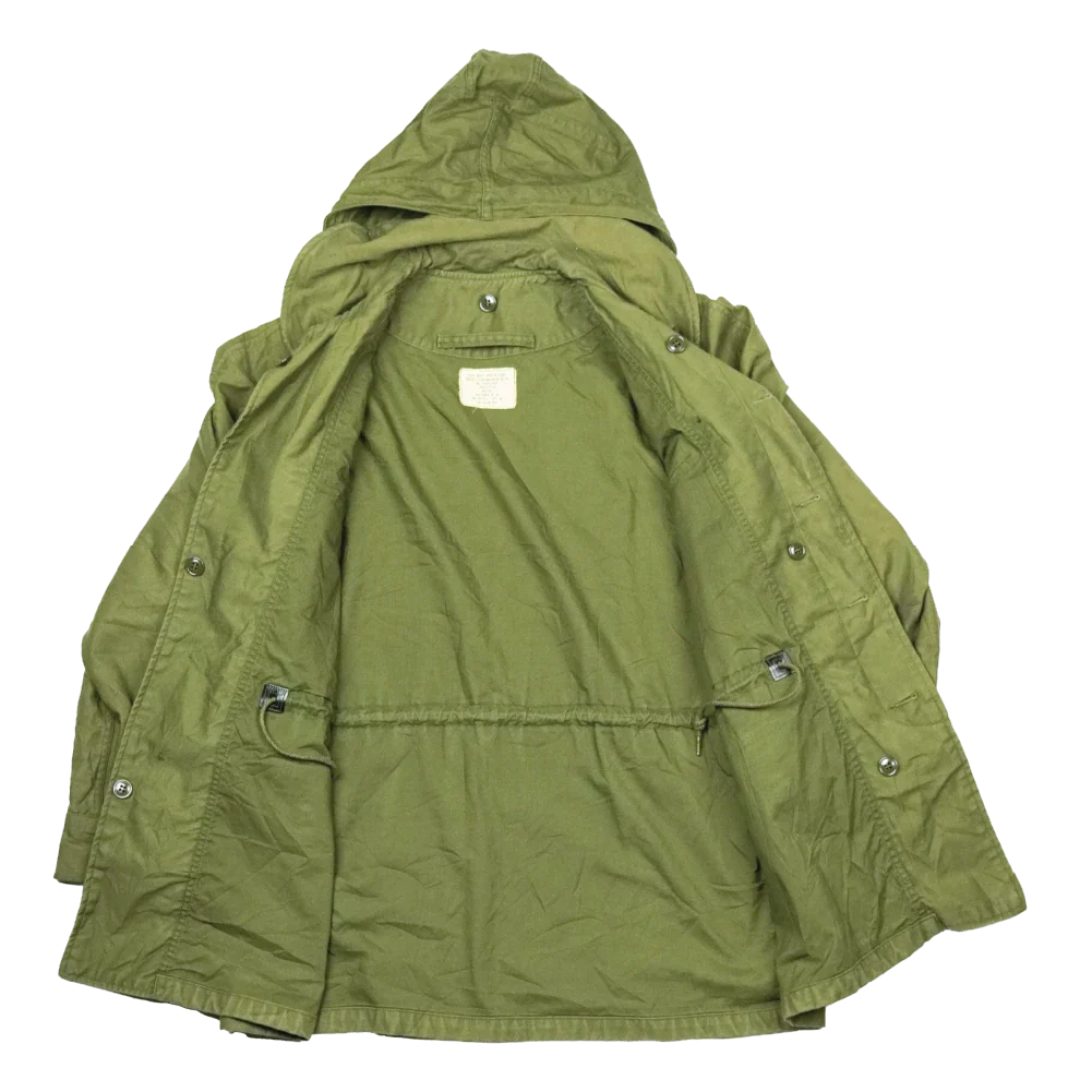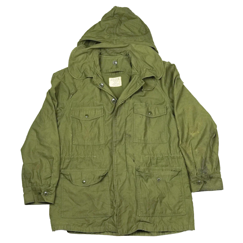 US Air Force wind resistant sateen jacket manufactured in 1965. The design sits between earlier and later US field jackets, with a front button closure and a stowable hood housed in a large collar.