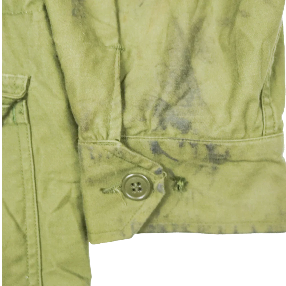 This example shows wear. There are stains on both sleeves and one button is missing from each cuff.