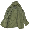 US Air Force sateen wind resistant field jacket in a small regular size. This is a field jacket style with a full front closure, button-adjustable cuffs, and multiple front pockets.