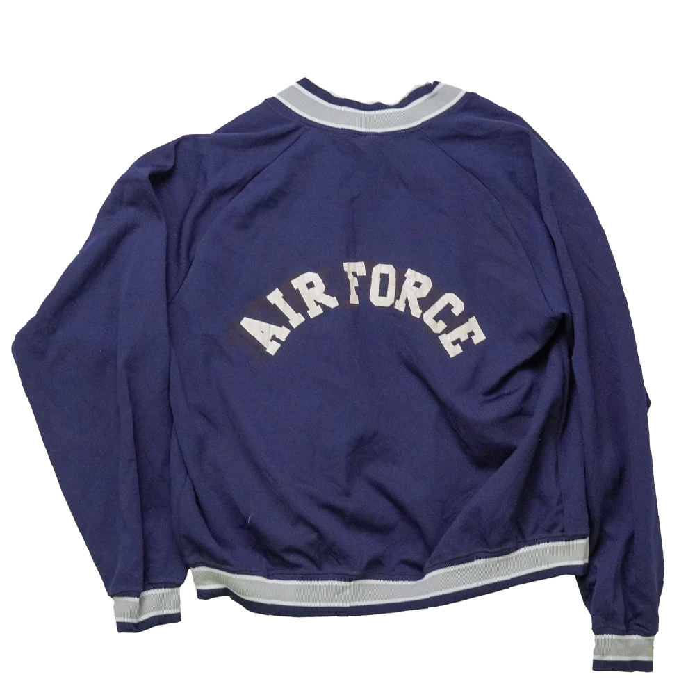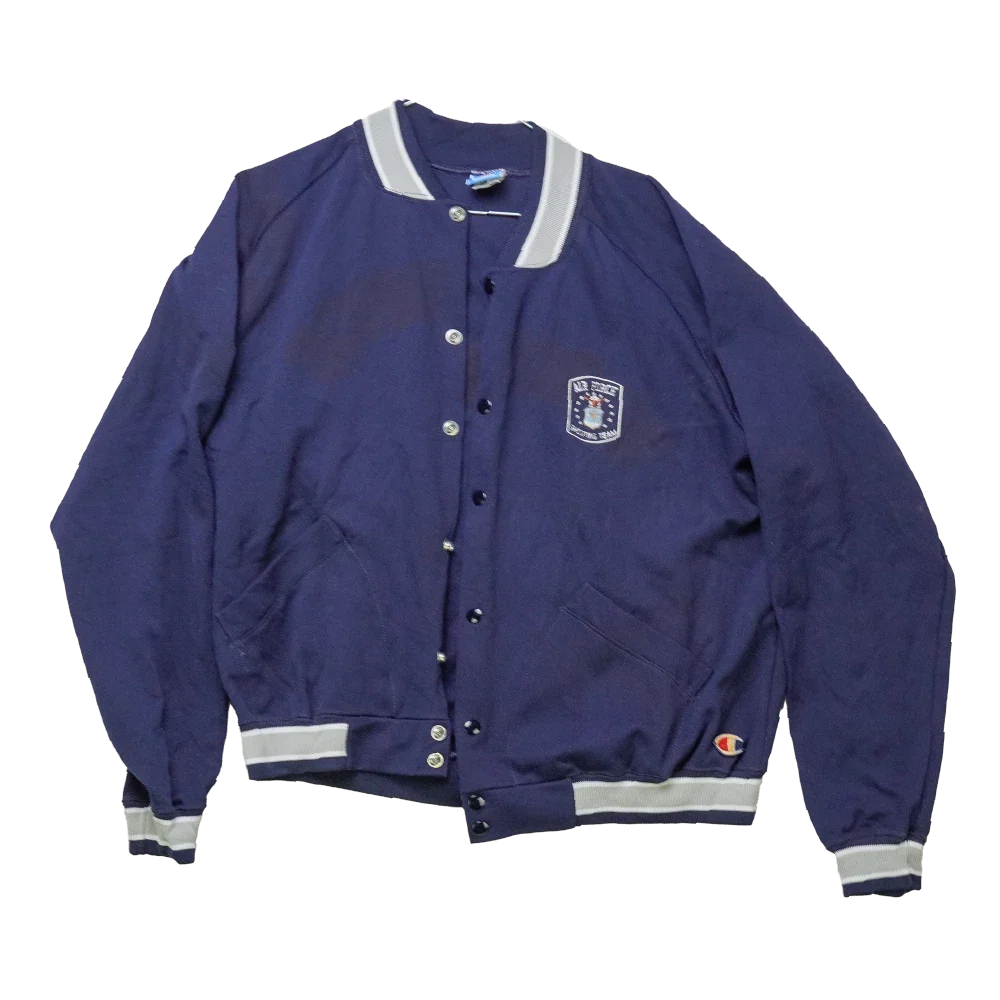 US Air Force Shooting Team jacket in size Large. Features printed team graphics and is manufactured by Champion in the USA. Dark stains are present on the front, possibly from the print.