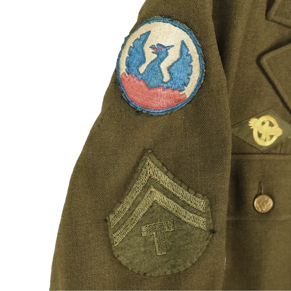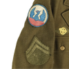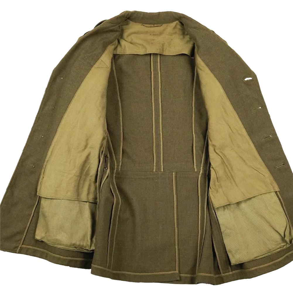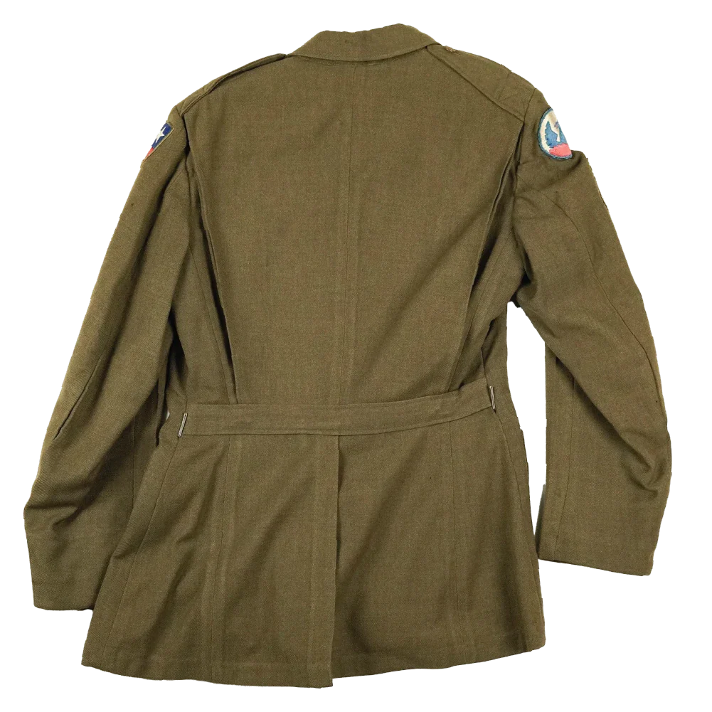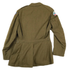 US Army wool service dress jacket from the Second World War period. The jacket is constructed from wool and retains its original service dress form with period insignia present.