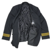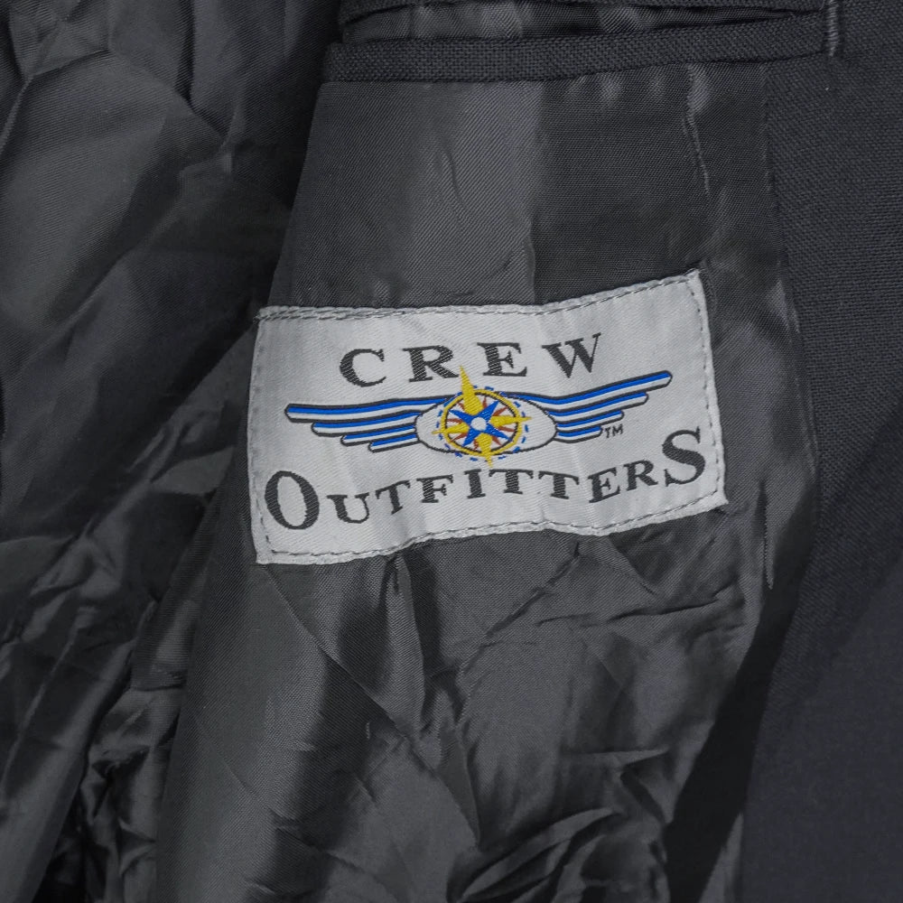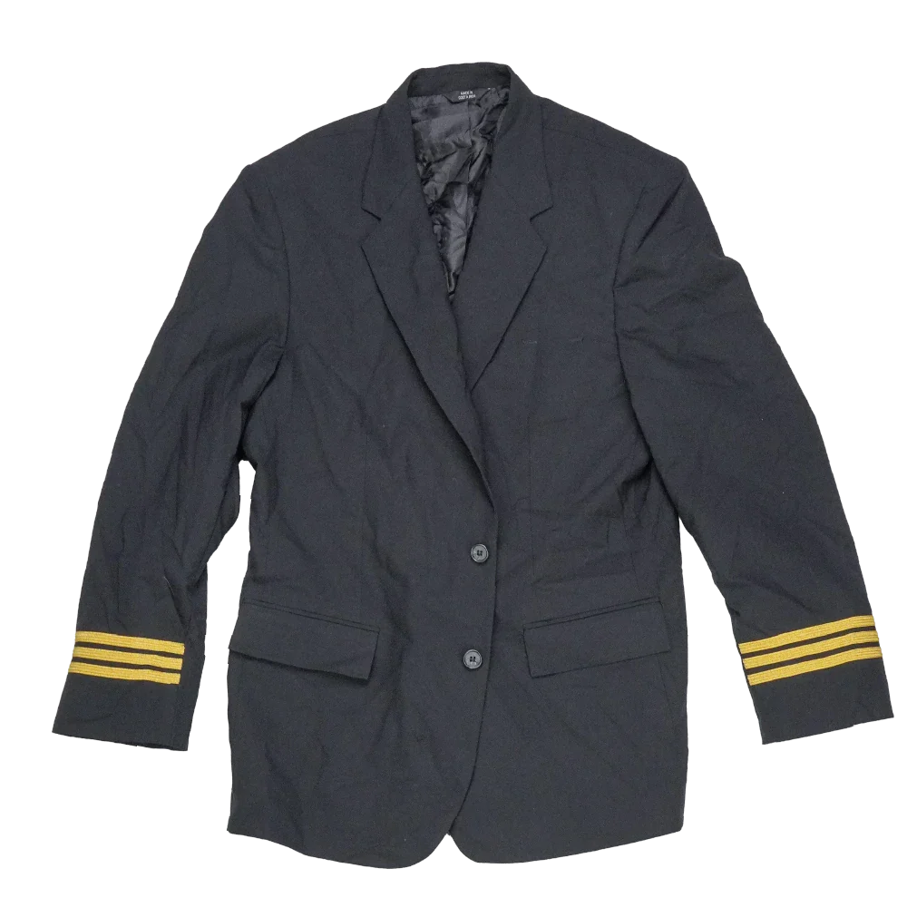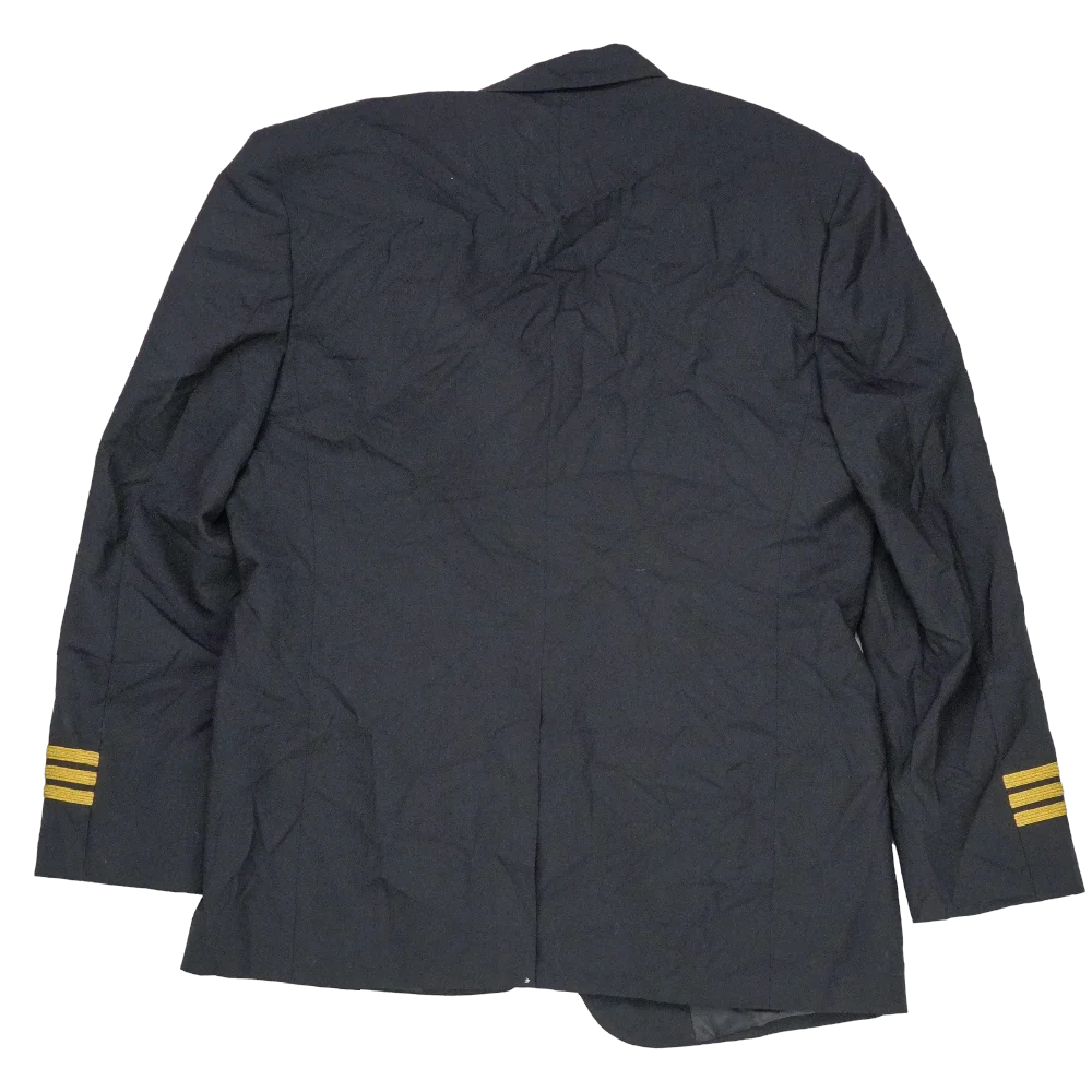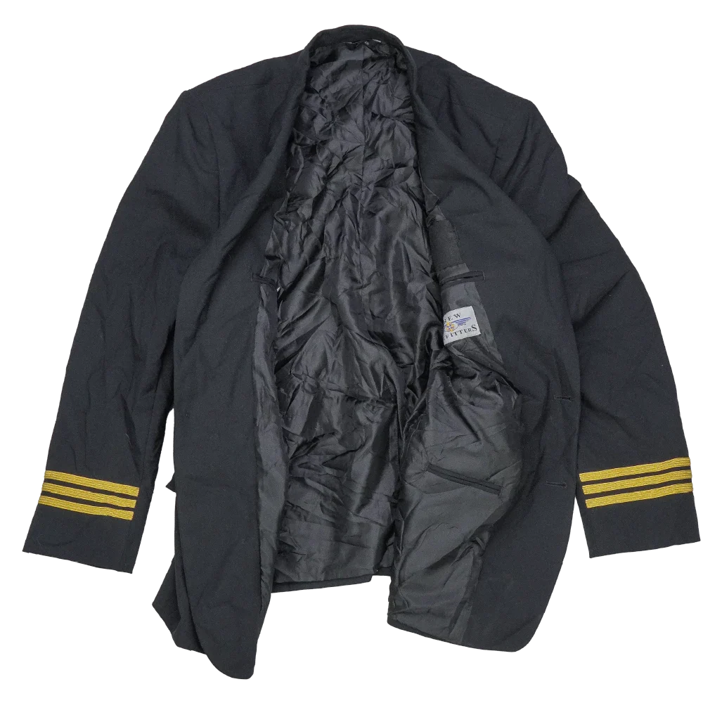 Commercial pilot 1st officer jacket in standard service dress style. Structured outer with front button closure, chest and lower pockets, and a tailored fit.