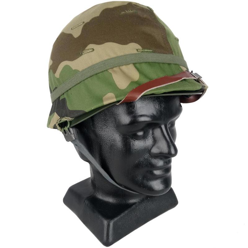 This is a combination of a genuine US (or European equivalent) M1 helmet and a commercially new woodland liner. The M1 steel pot is a classic helmet which were originally issued from WWII, then for the proceeding 40 years. Many NATO countries adopted the design, making adjustments and adding their own liners.