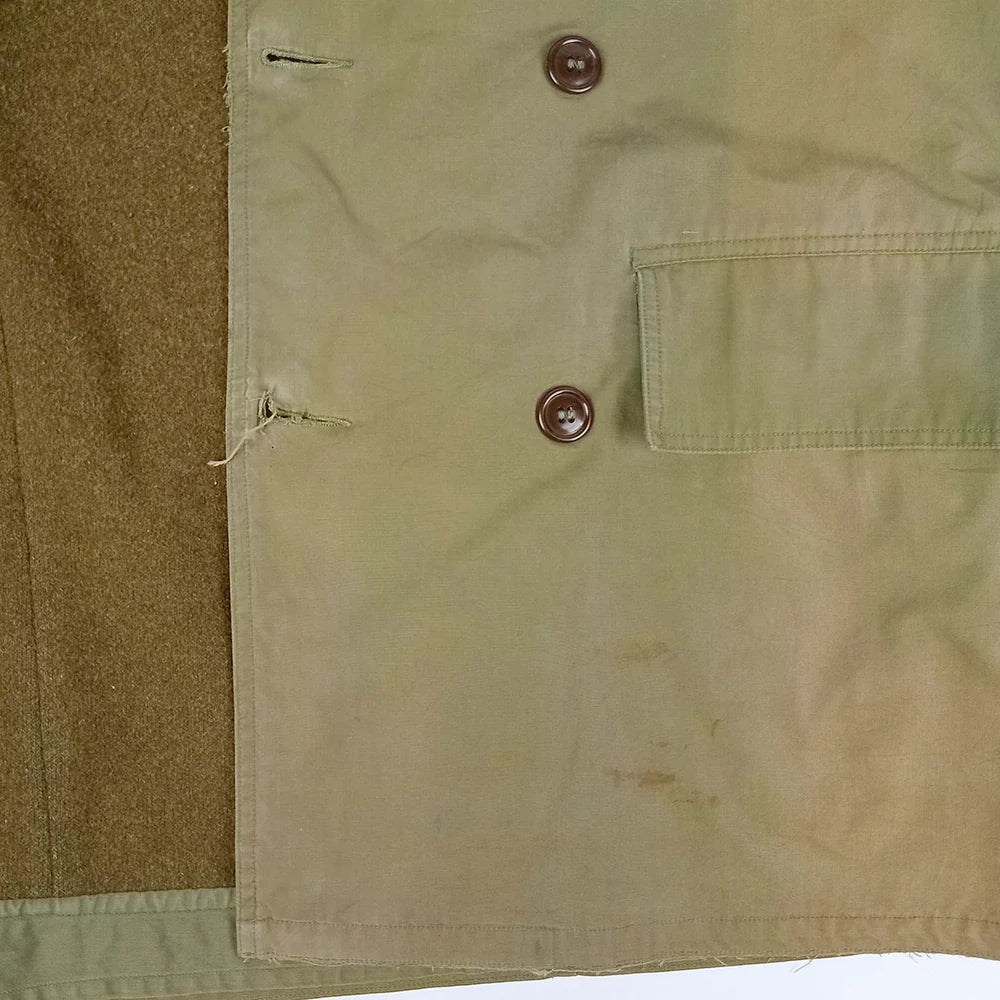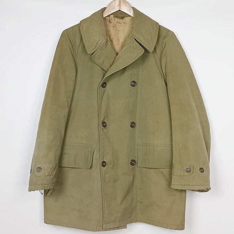 Notched lapel collar without belt version, later replaced by the M-43 field jacket. A mid-length double breasted coat made to keep US soldiers protected from the elements in WWII. This one has seen better days but we think it adds to the charm. Where the sleeve cuffs are worn, you can see the felted lining - a common abrasion area in these jackets.