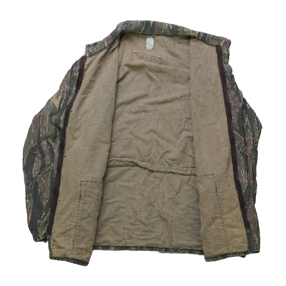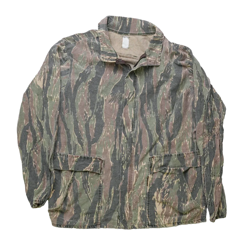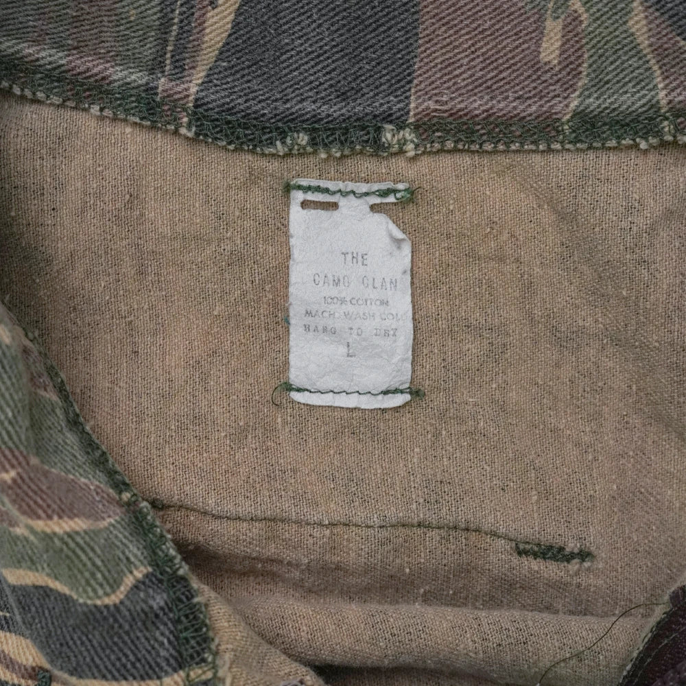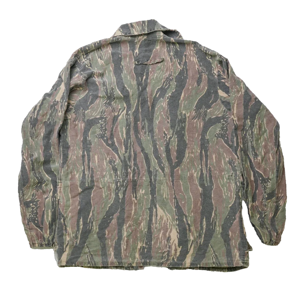 US made 1980s Tiger Stripe shirt in Large. Classic tiger stripe camouflage pattern with standard button front construction.