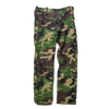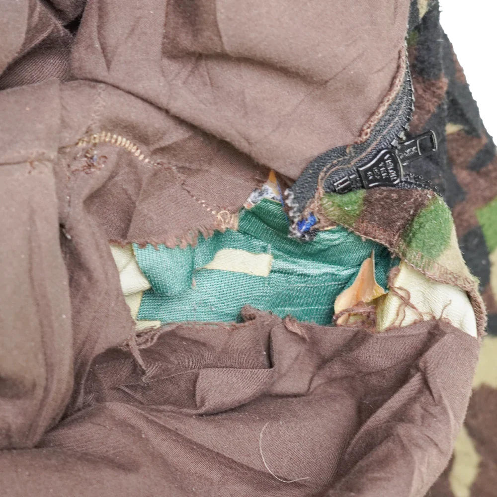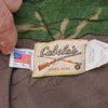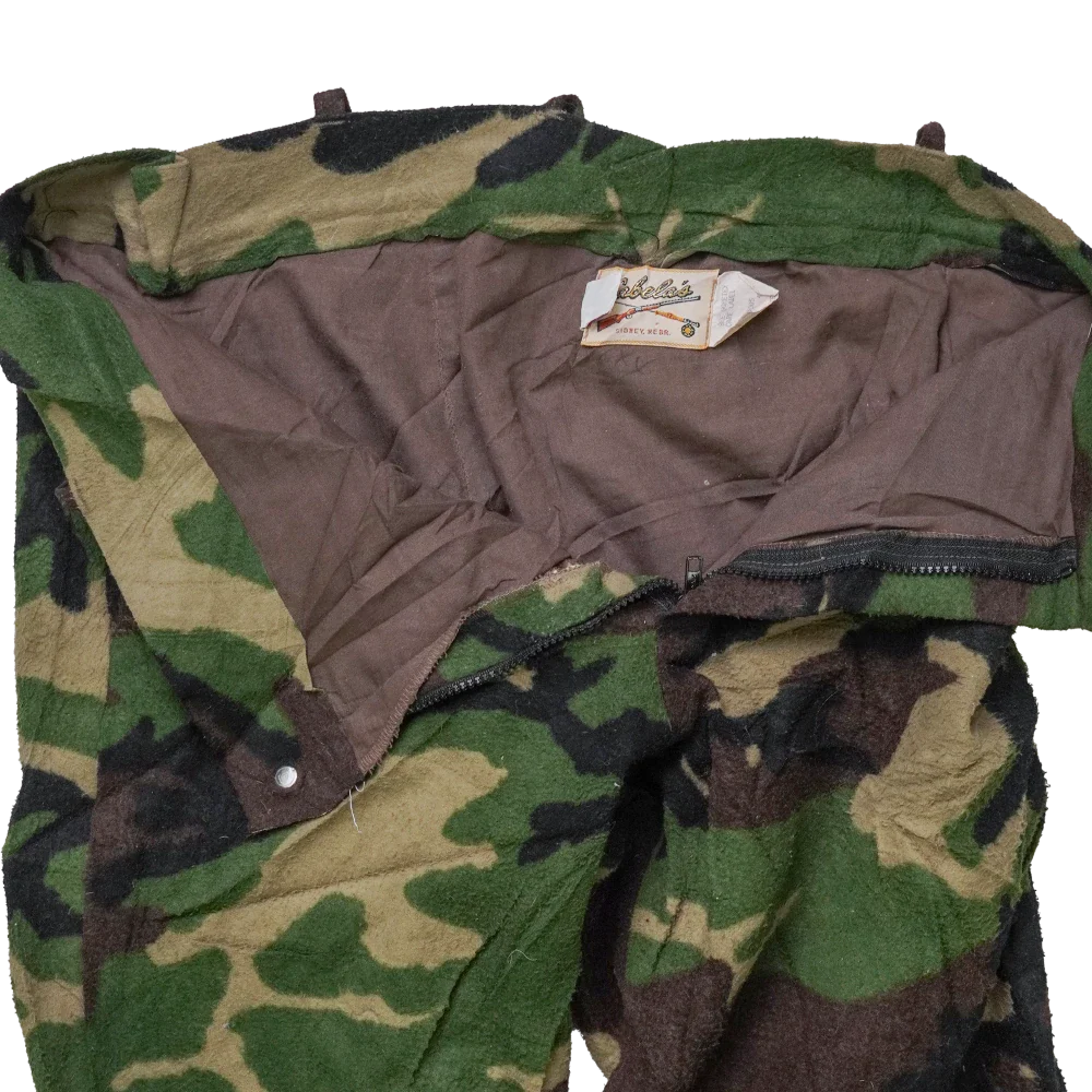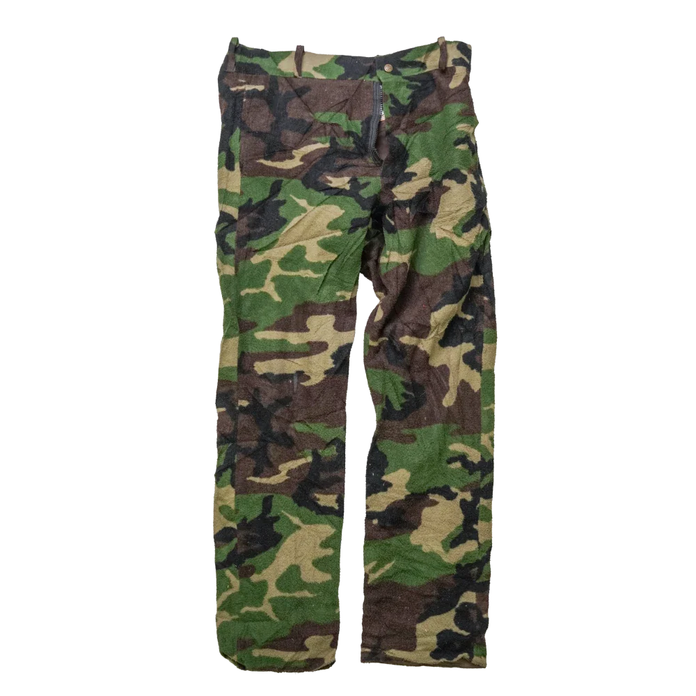 US made Cabela’s woodland camouflage fleece trousers. Heavy fleece outer in classic woodland pattern with a brown interior lining. Zip fly with metal top button closure and belt loops at the waistband.