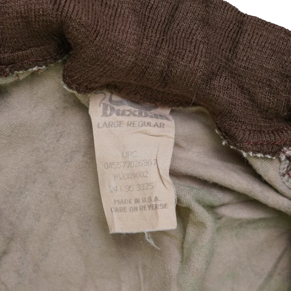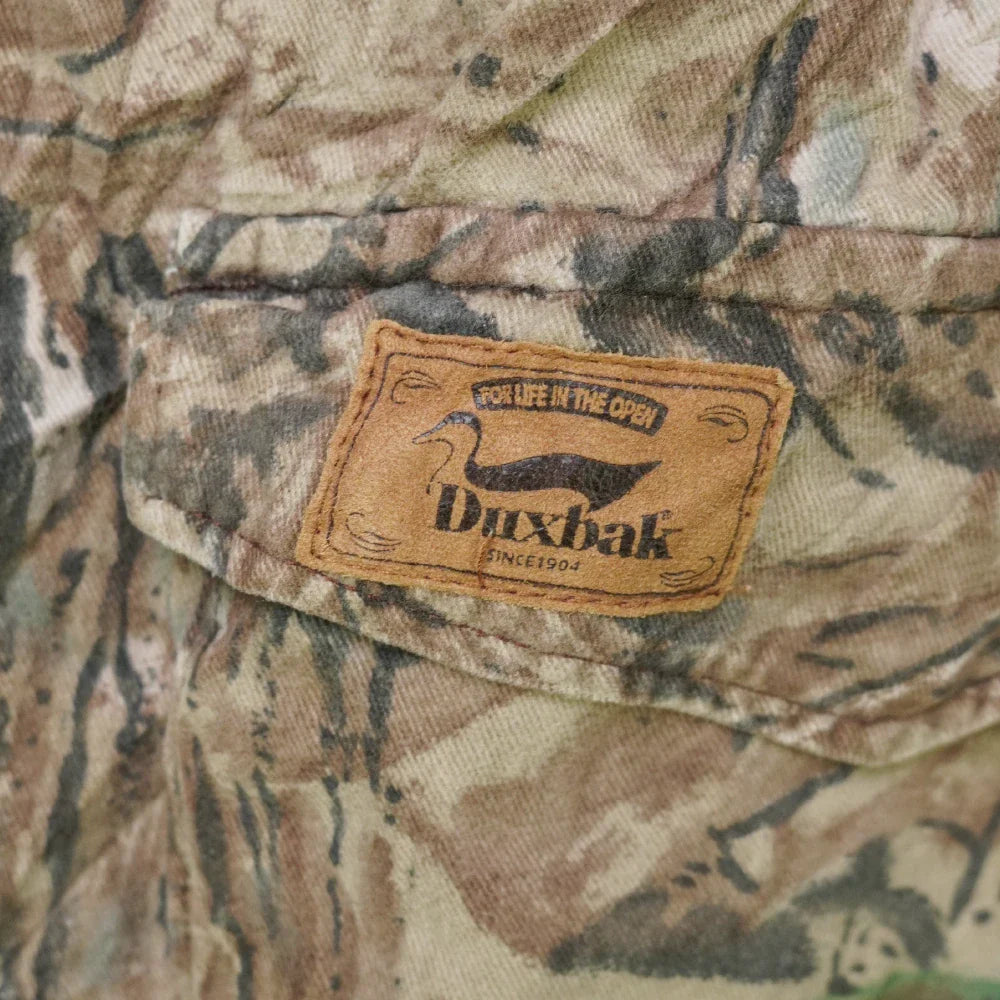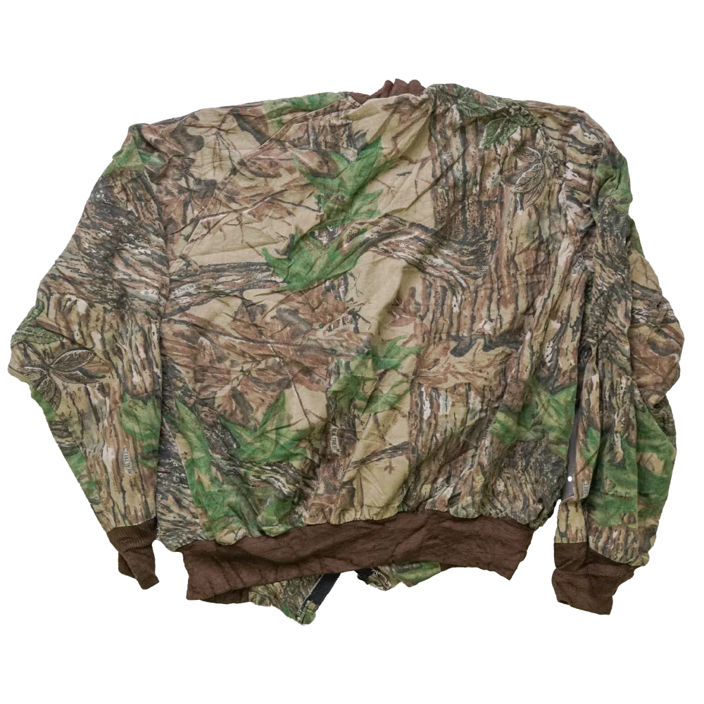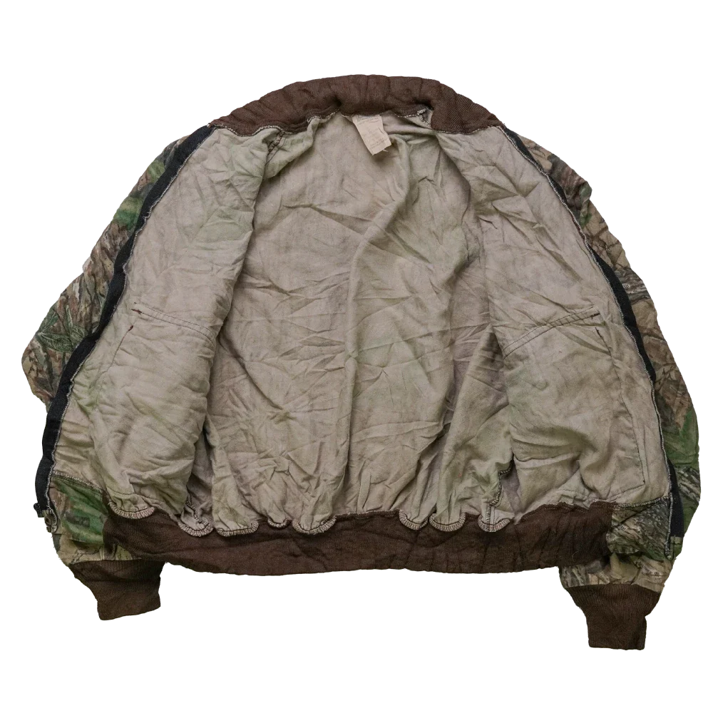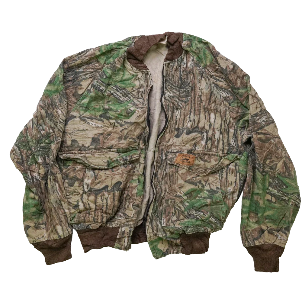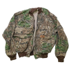 US-made Duxbak bomber jacket in Realtree camouflage. Waist-length bomber cut in Used/Very Good condition.