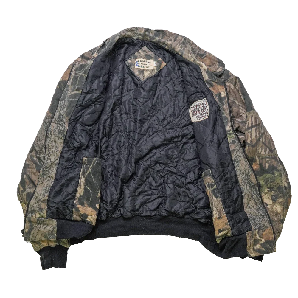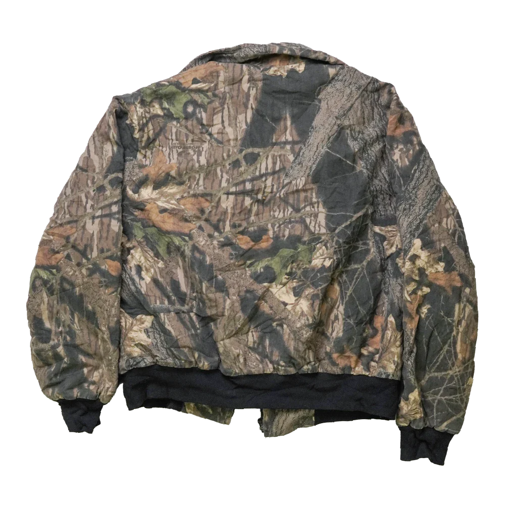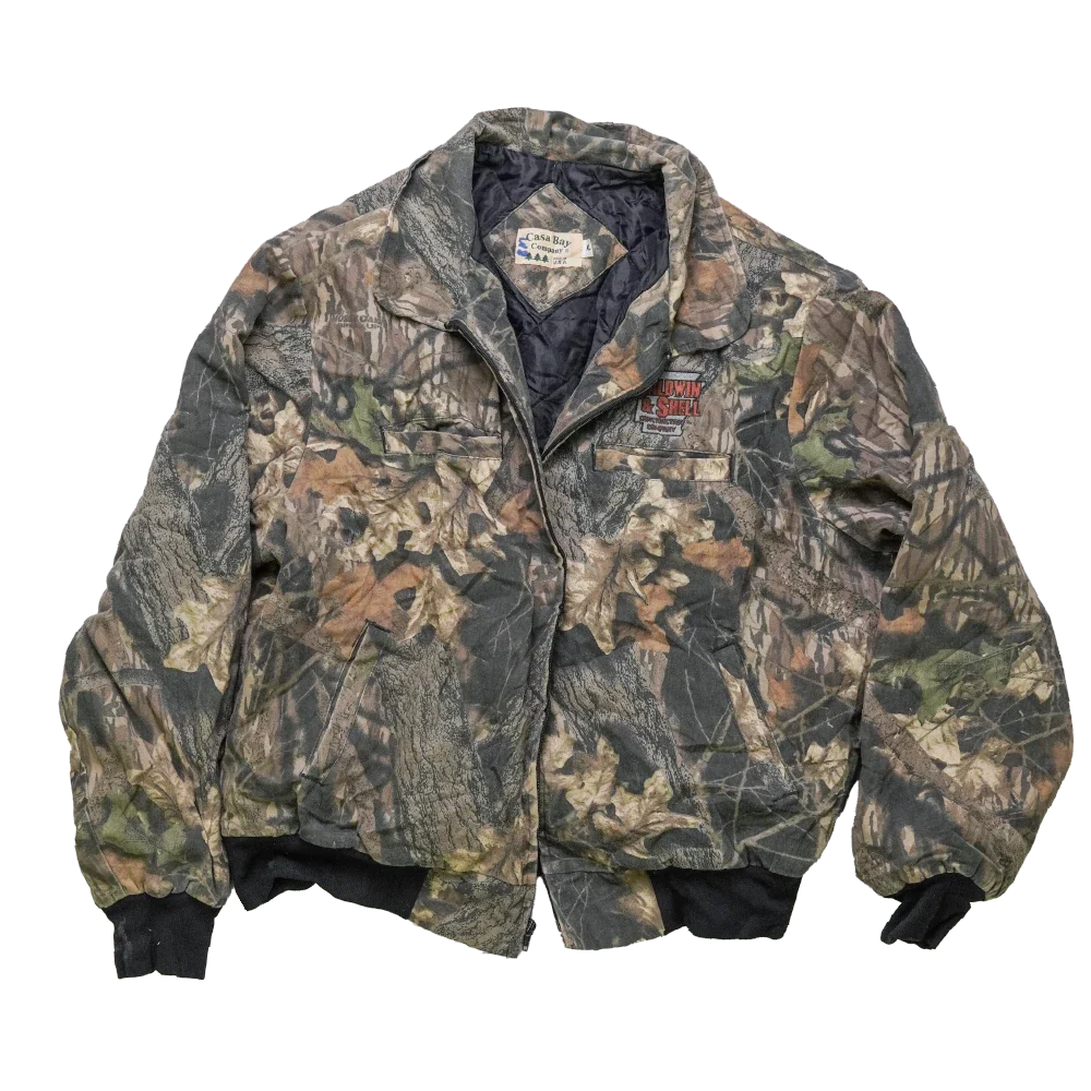 US-made Mossy Oak bomber jacket in XLarge (116-122cm). Features an embroidered “Baldwin & Shell Construction Company” logo on the chest. Classic bomber cut with ribbed trims.