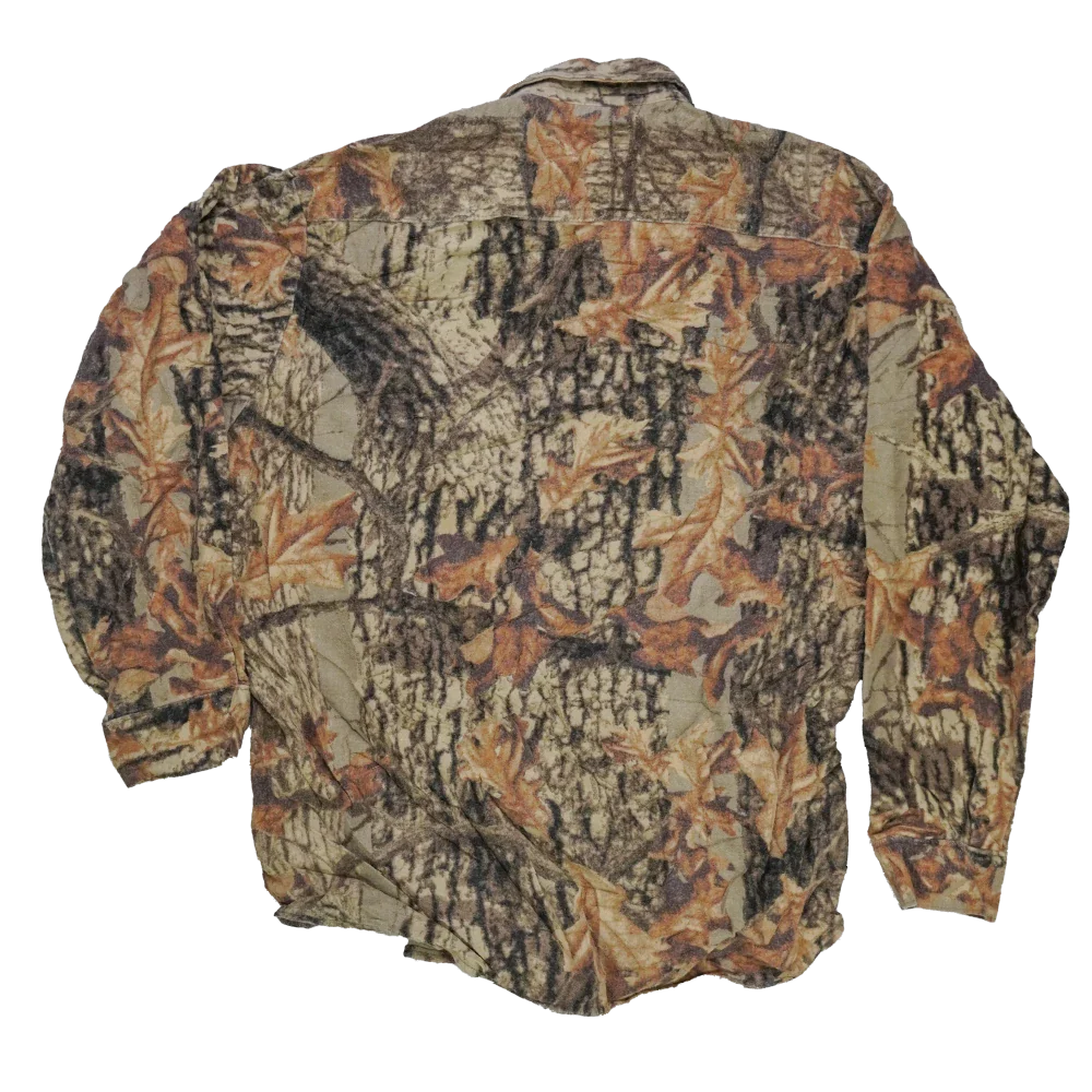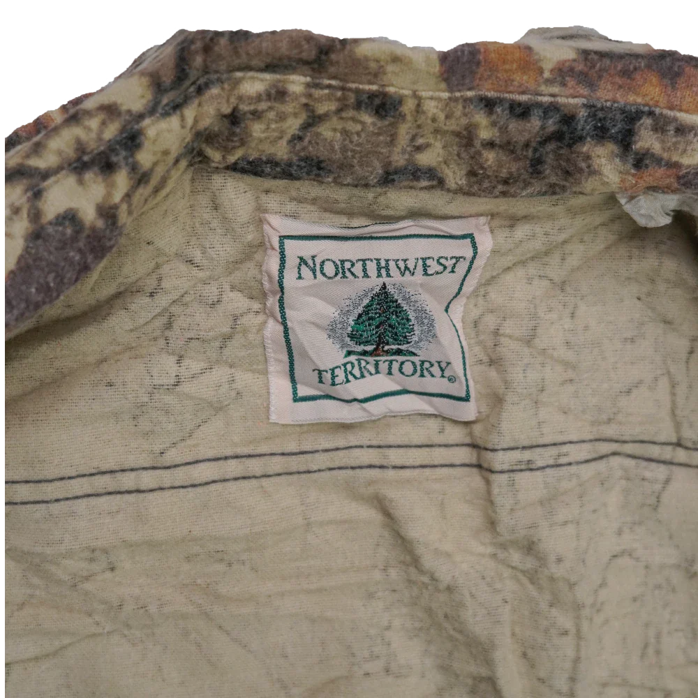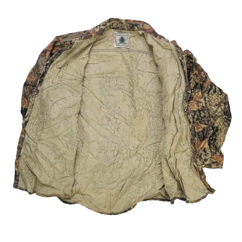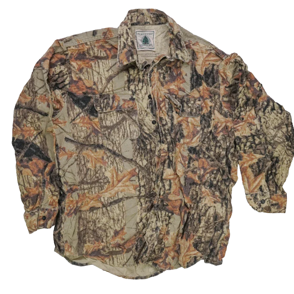 US-made Northwest Territory camouflage field shirt in a large size. Features a hunting camouflage pattern and traditional long-sleeve shirt construction.