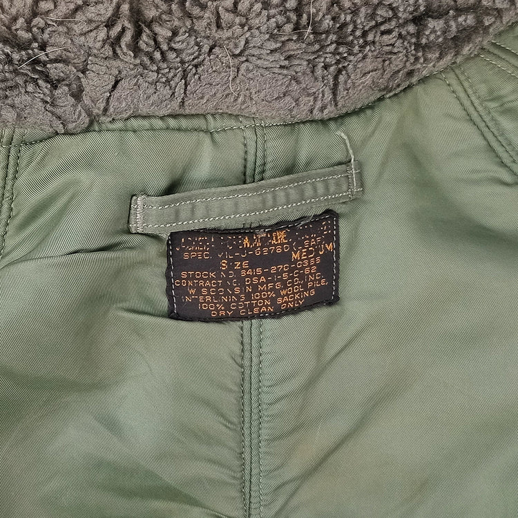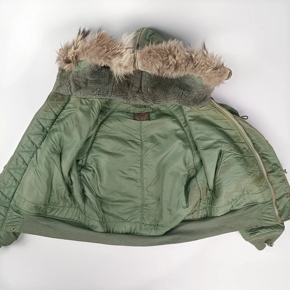 Classic flight jacket with cropped body stopping at the hips and zip through hood, that can be laid across shoulders. The short body and collapsible hood make this jacket a little easier to wear in the cockpit. Contract dated from 1962.