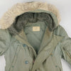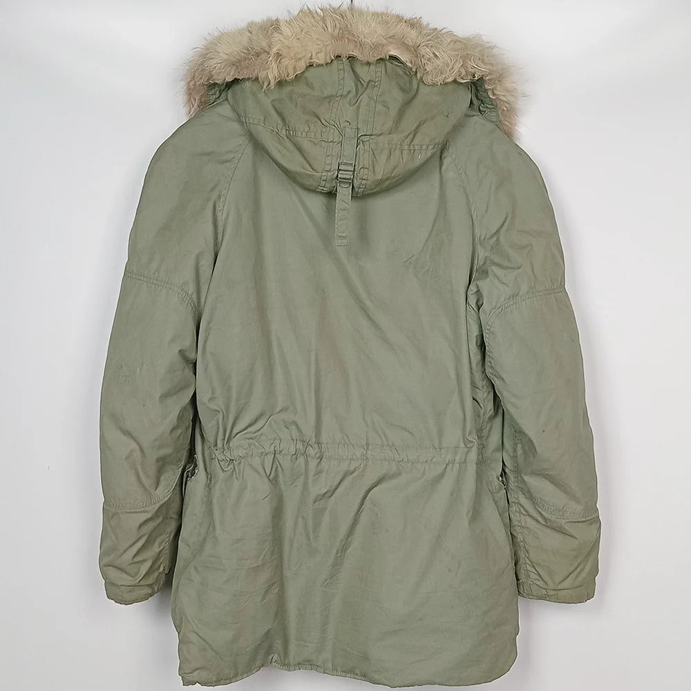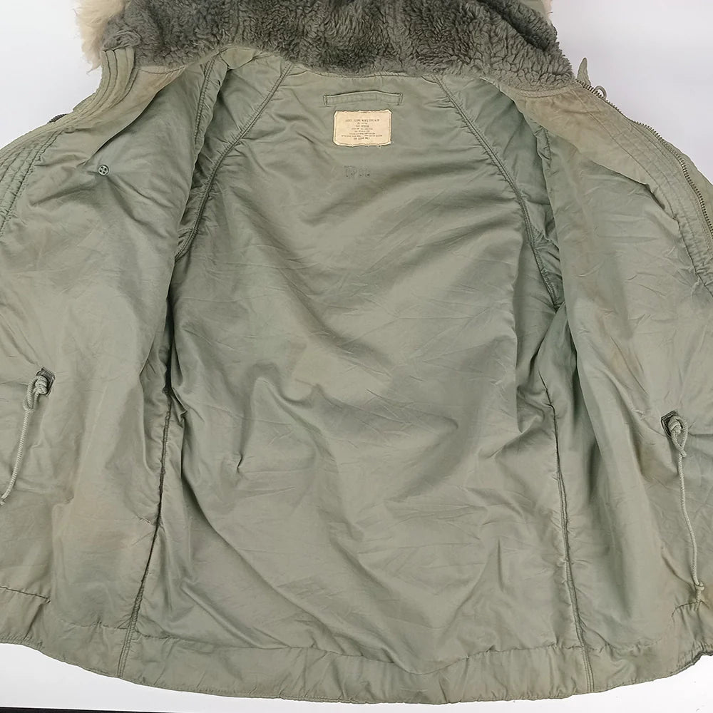 Faded sage green with non-shiny fabric. Pairs attractively with pale fur ruff that is dense and not shedding. Vintage with DSA reading 1969 and ready for many warm winters ahead.