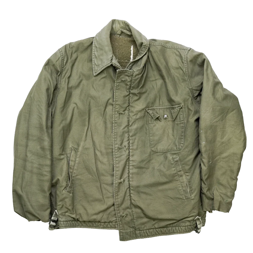 US Navy A-2 deck jacket in size Large. Military surplus outer jacket with a heavyweight build typical of the A-2 pattern.