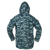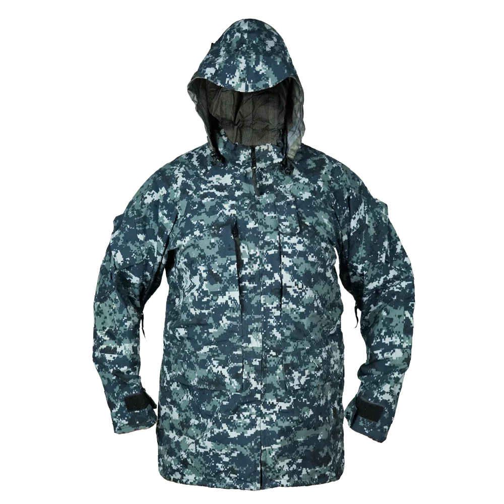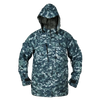 U.S. Navy wet-weather jacket in Digital Type I (NWU Type I) camouflage. Constructed as a waterproof outer shell with an integrated hood and full front zip with storm flap.