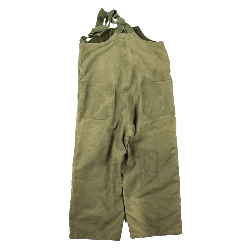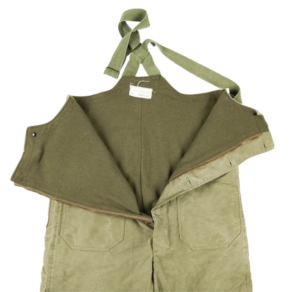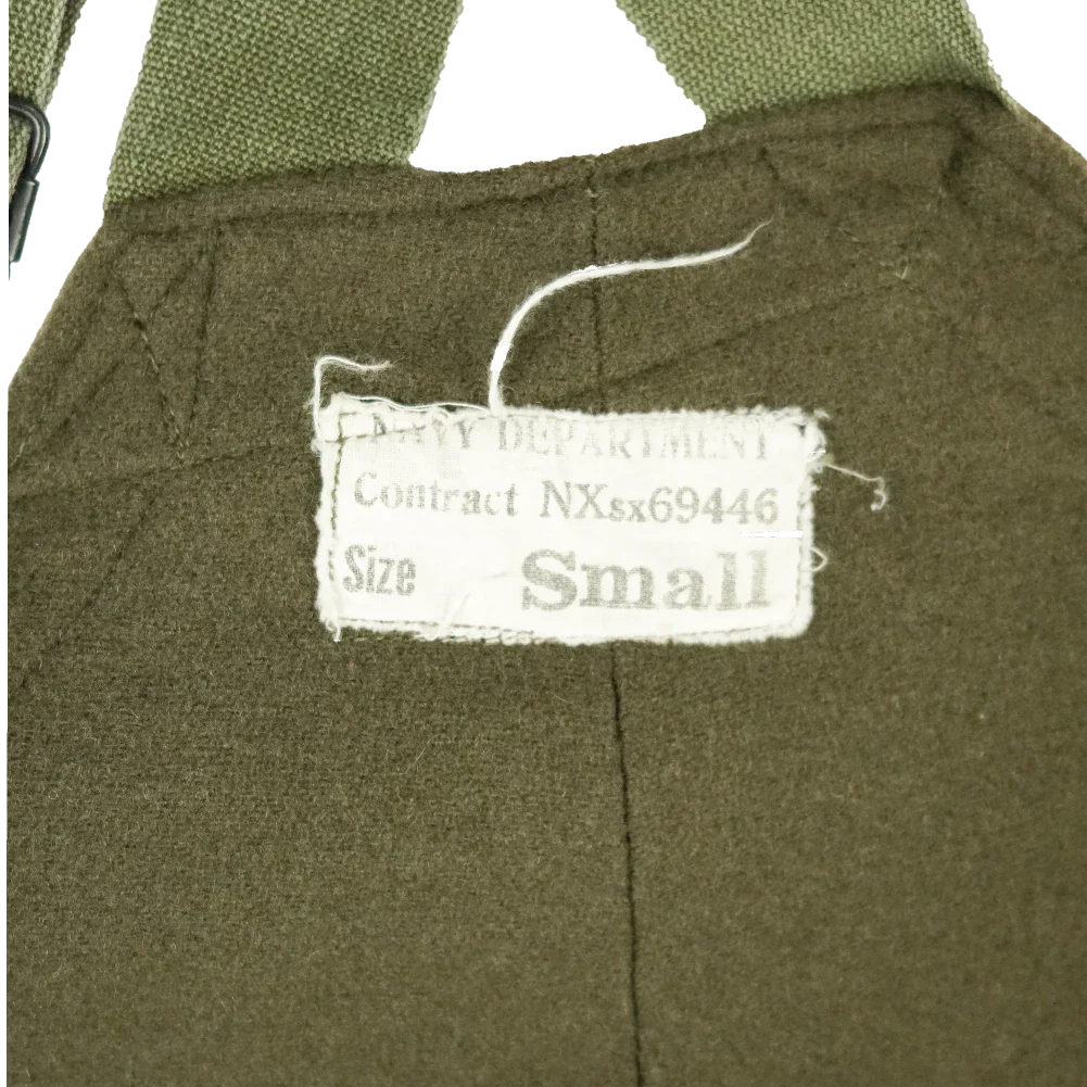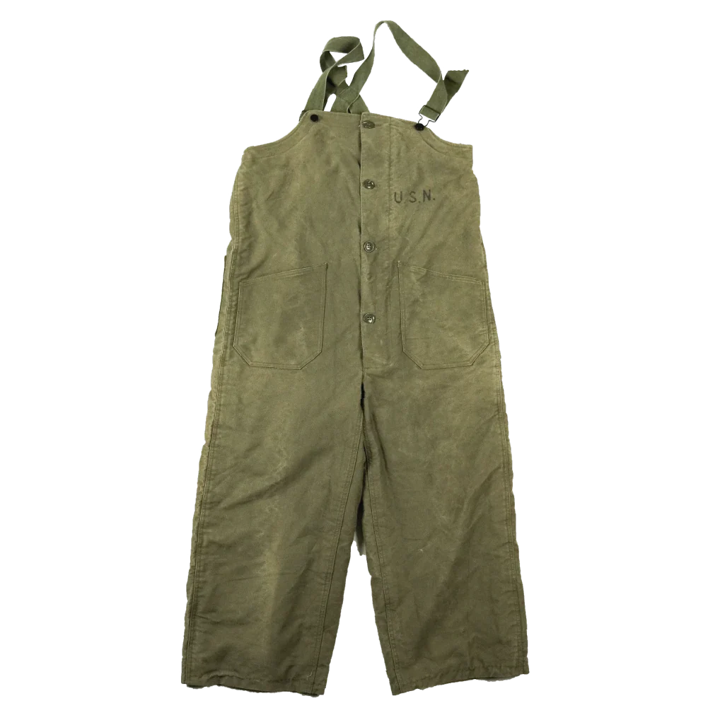 US Navy N-1 deck trousers in a small size. This item is a surplus example with a used condition, showing general wear consistent with prior use.