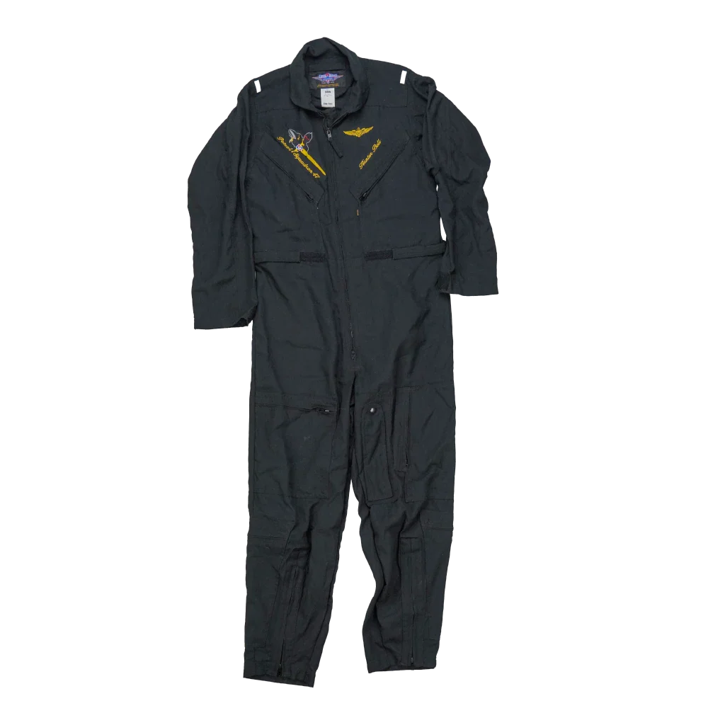 US Navy Patrol Squadron 47 pilot coveralls in a one-piece flight suit design. This military surplus garment features long sleeves and full-length legs as part of its integrated coverall construction.