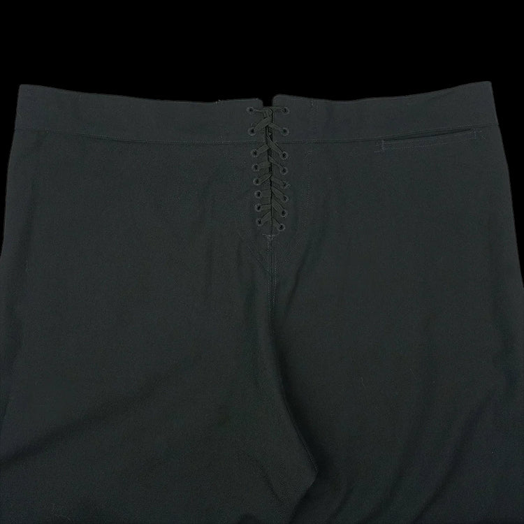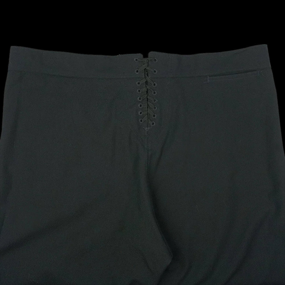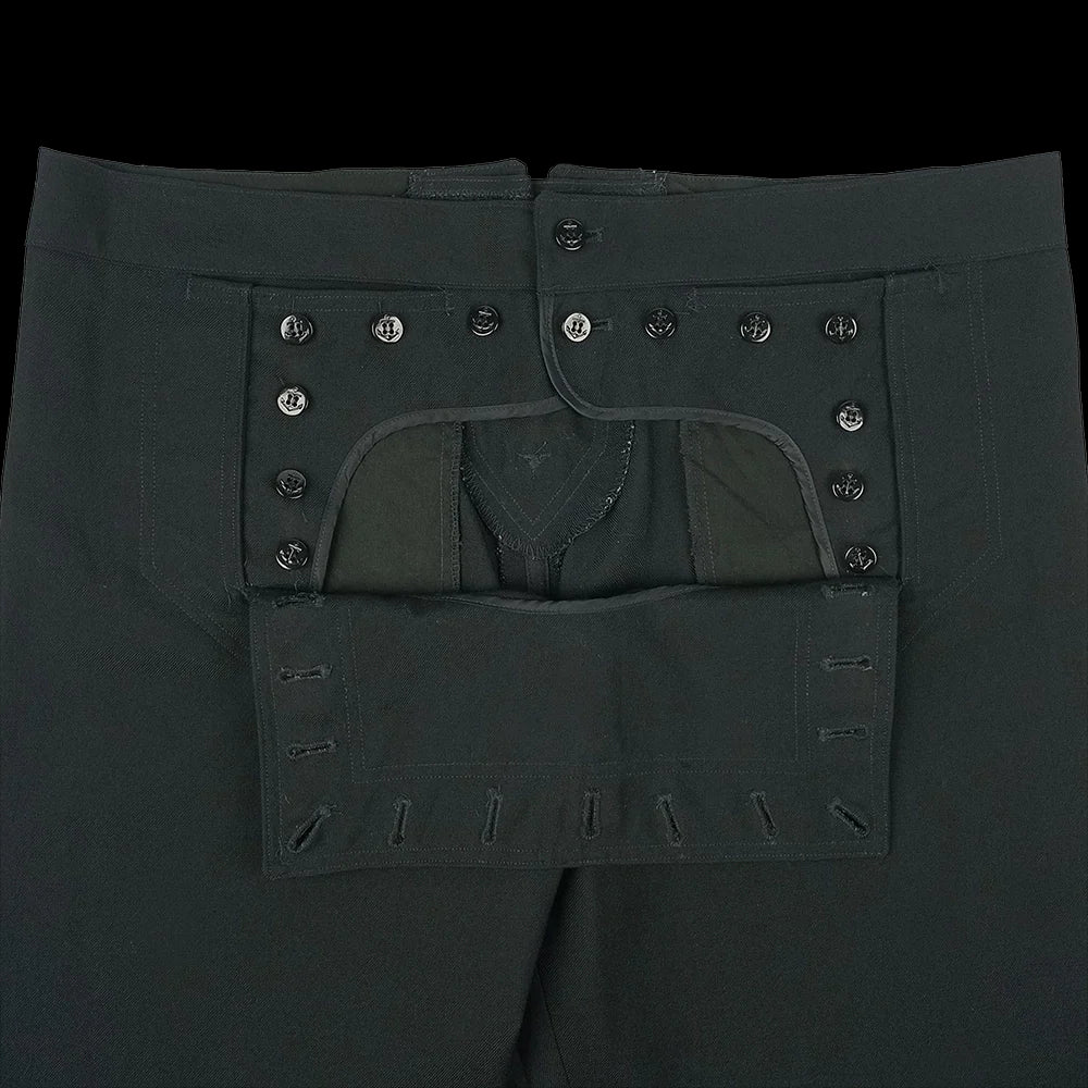 The more modern (but still without a zip!) classic piece of US Navy attire, the black 13 button broadfall flap trousers, also known as ''cracker Jack'' pants and were part of the uniform for colder months or Service Dress. Made with black twill wool, these high waisted trousers have less flare to the leg cut than in the past and are also lighter in weight than the felted wool version. The front fastening may take some getting used to but you'll soon be converted! Classic naval attire - perfect for collectors, vintage aficionados and fans of fancy pants.