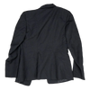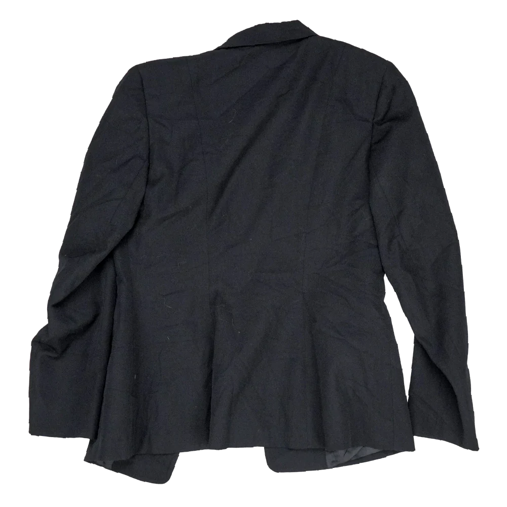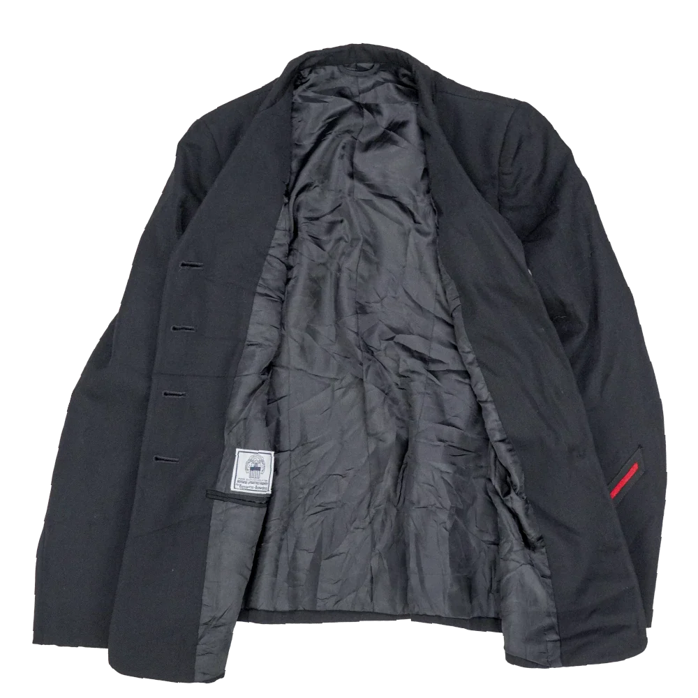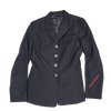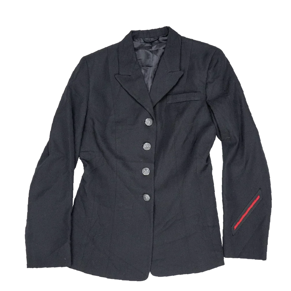 US Navy women’s service dress jacket in a tailored cut with a structured silhouette. Dark navy fabric outer with a smooth full lining, featuring a notched lapel, front button closure, and shaped seams through the body for a fitted profile. Includes a chest welt pocket and a sleeve detail with a red stripe accent.