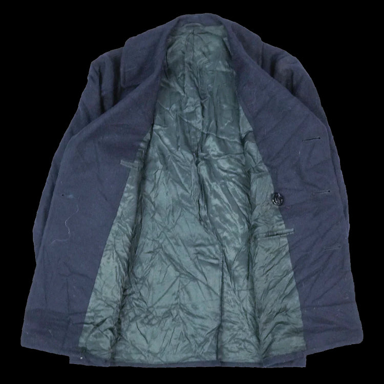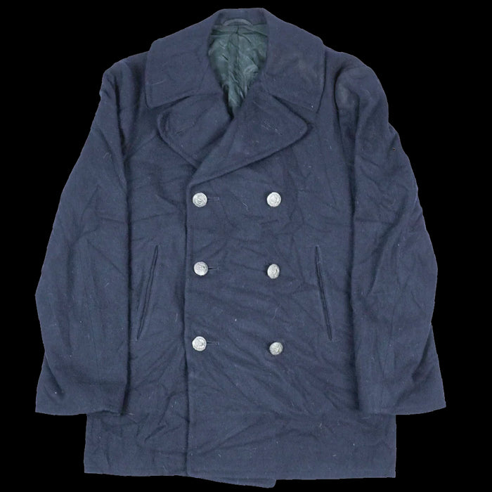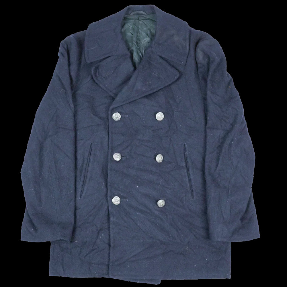 US Navy wool pea coat with metal buttons bearing US Navy insignia. The coat includes hip pockets and two internal pockets.