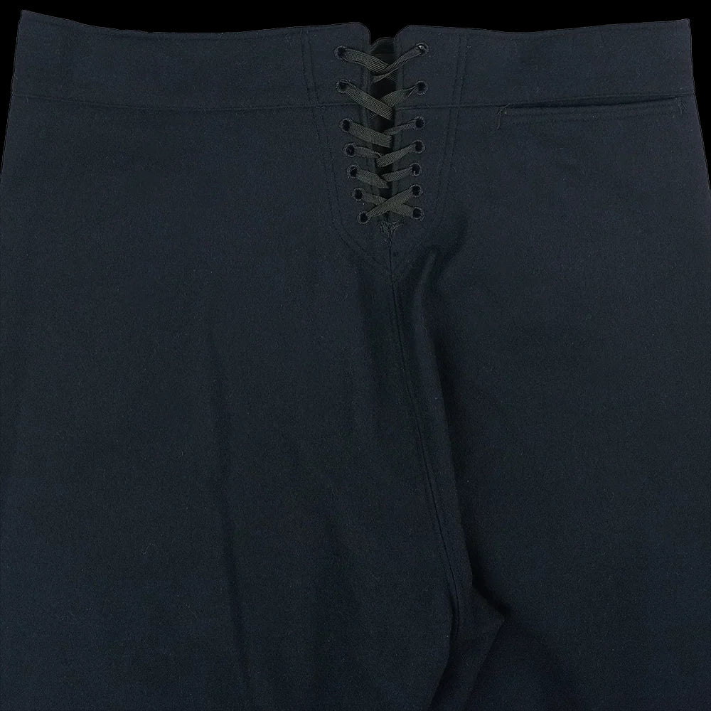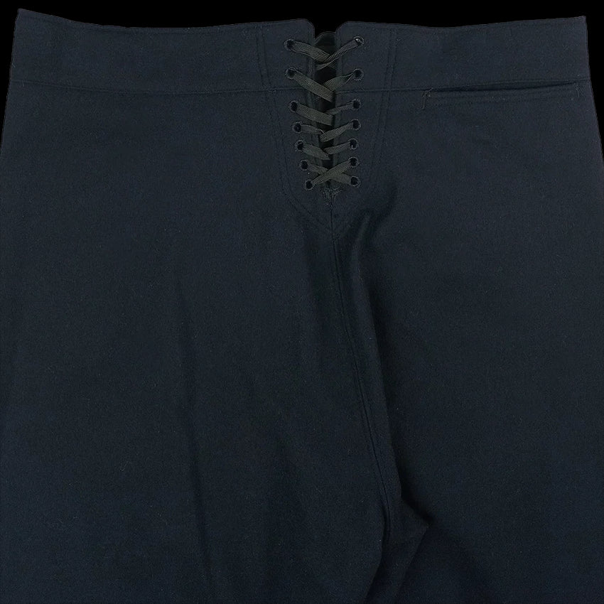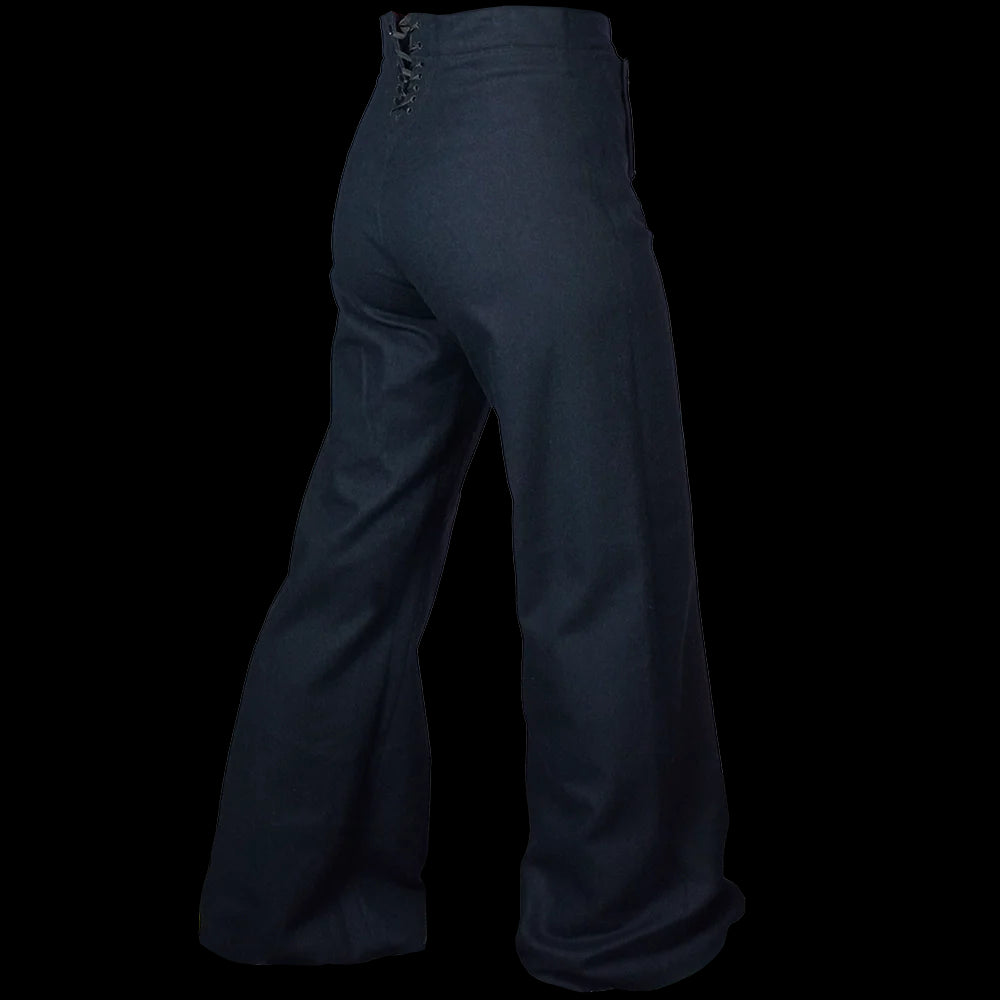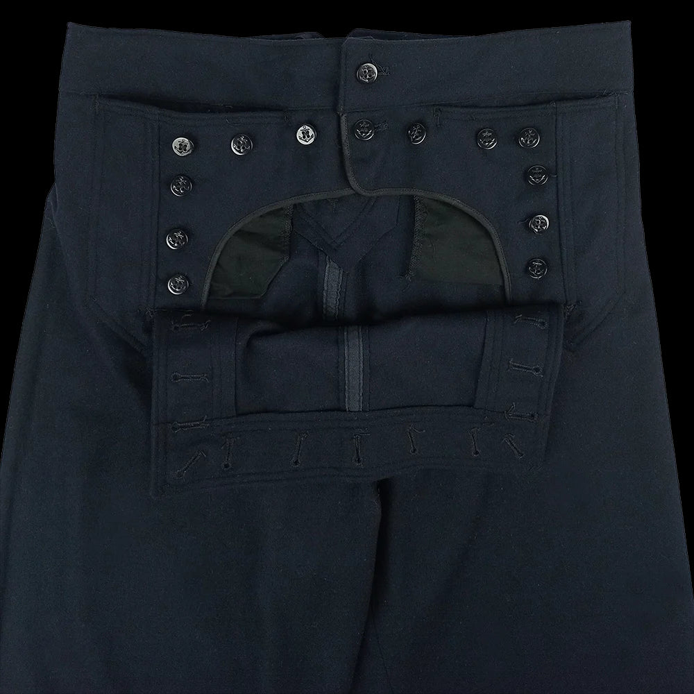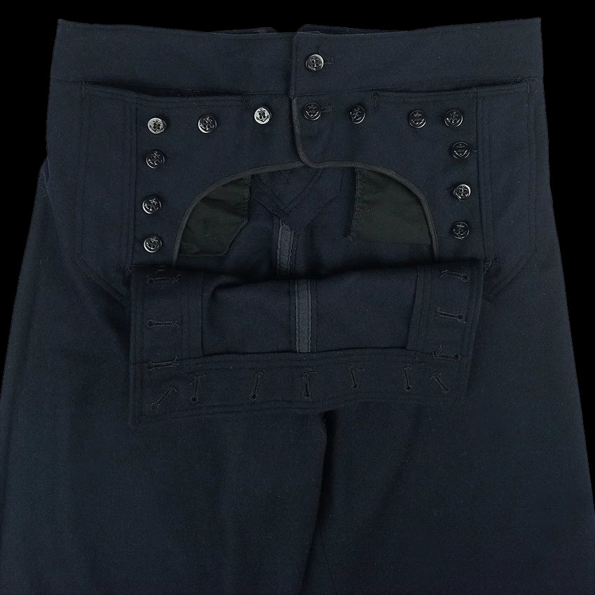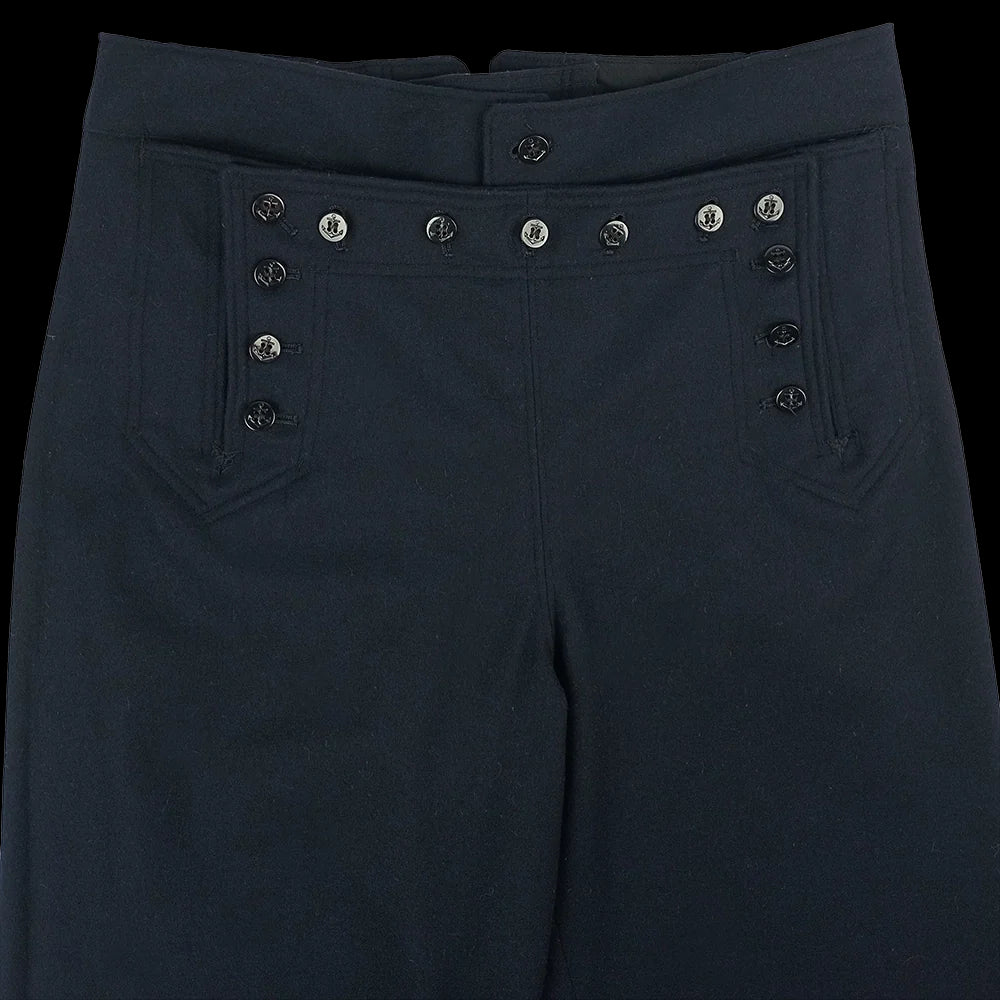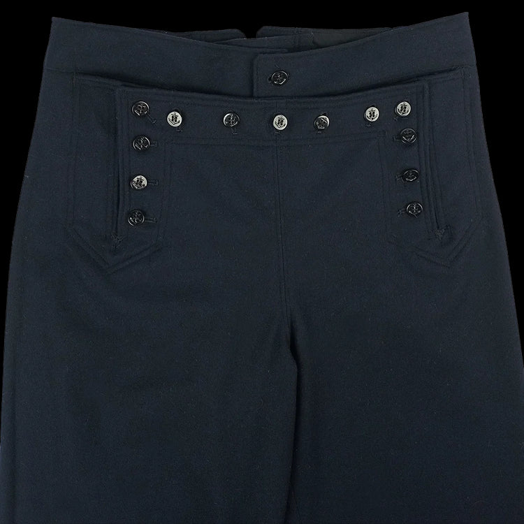 A classic piece of US Navy attire, the 13 button broadfall flap trousers, also known as ''cracker Jack'' pants. These are high waisted, thick felted wool with the classic bell bottom cut. The front fastening may take some getting used to but you'll soon be converted! These are classic naval attire, perfect for collectors, vintage aficionados and fans of fancy pants.