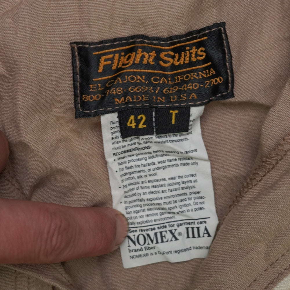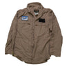 US tan flight suit shirt with AH-1 Cobra patch. Features a front zip closure and long sleeves. Made in USA.