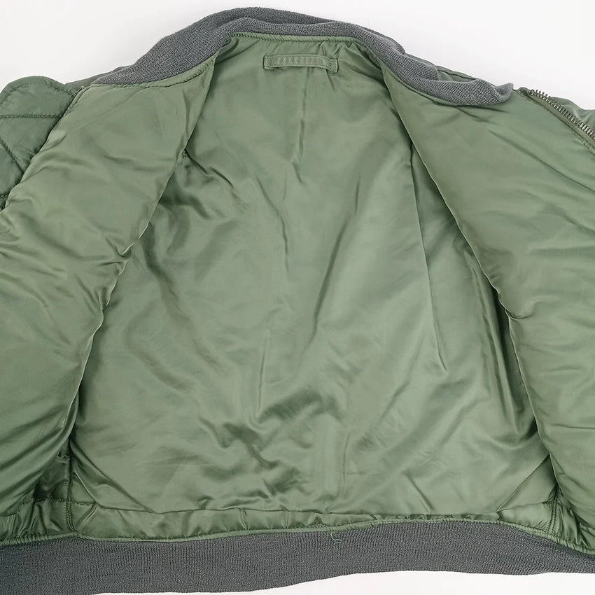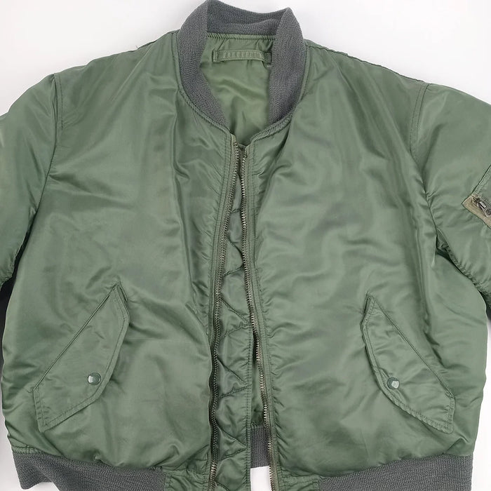 The USAF MA-1 Intermediate Flight Jacket, introduced in the 1950s, was designed for jet-age pilots operating in moderate climates. Made from durable nylon it quickly became an icon of U.S. Air Force gear. Its knit cuffs, waistband, and collar provided warmth and comfort in cockpits. Widely adopted by military and later civilians, the MA-1 remains a timeless symbol of aviation heritage and Cold War style. This jacket (and the other for sale) do not have the reversible orange lining but subdued sage green, like the exterior. This jacket is in very tidy condition except for the bottom left knit edge has a small hole (~1.5cm) to the outer layer. Light, spotty stains run up the right chest to shoulder, across the back and on outer arms.