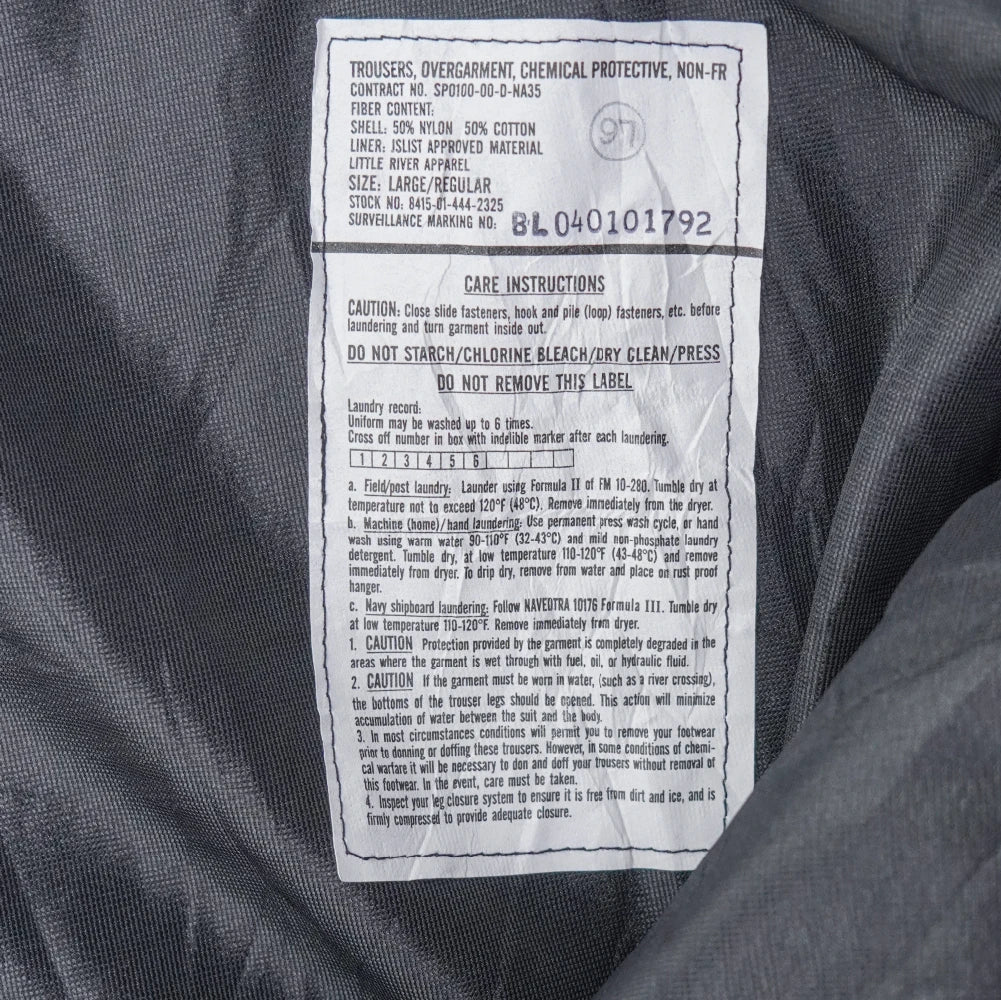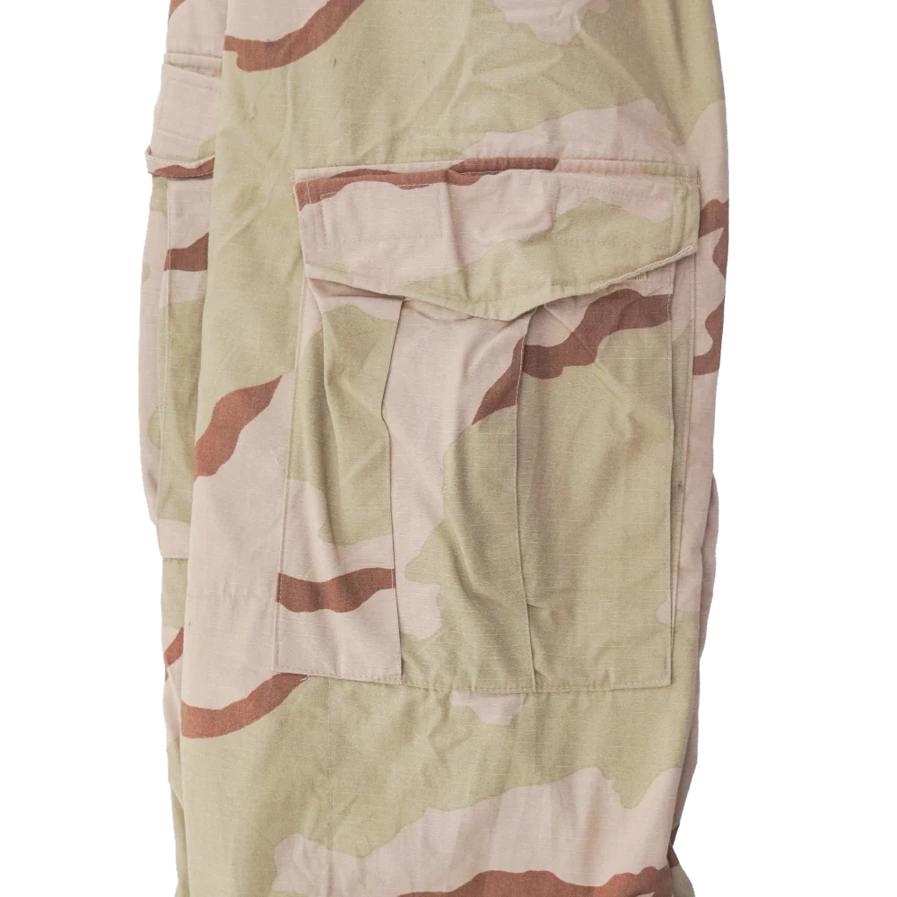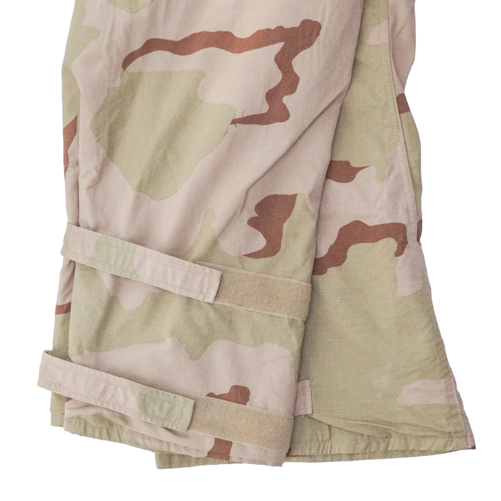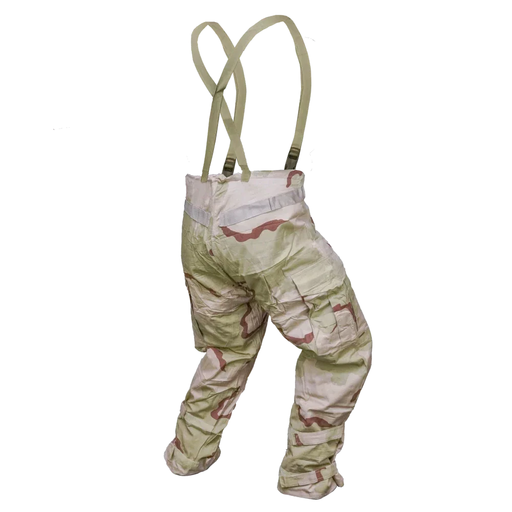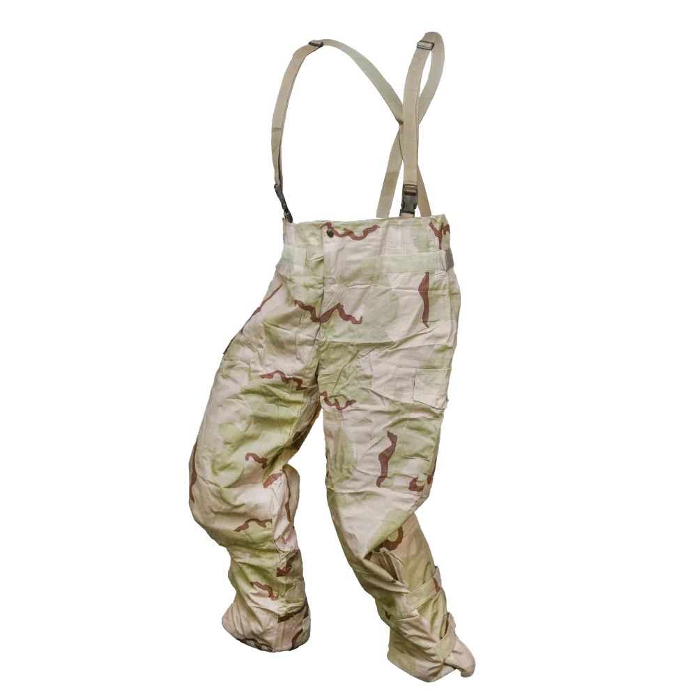 USGI late model NBC overgarment trousers in 3 Colour Desert camouflage. Made from a 50% nylon / 50% cotton shell with a protective inner liner, designed as part of the U.S. military chemical protective clothing system.
