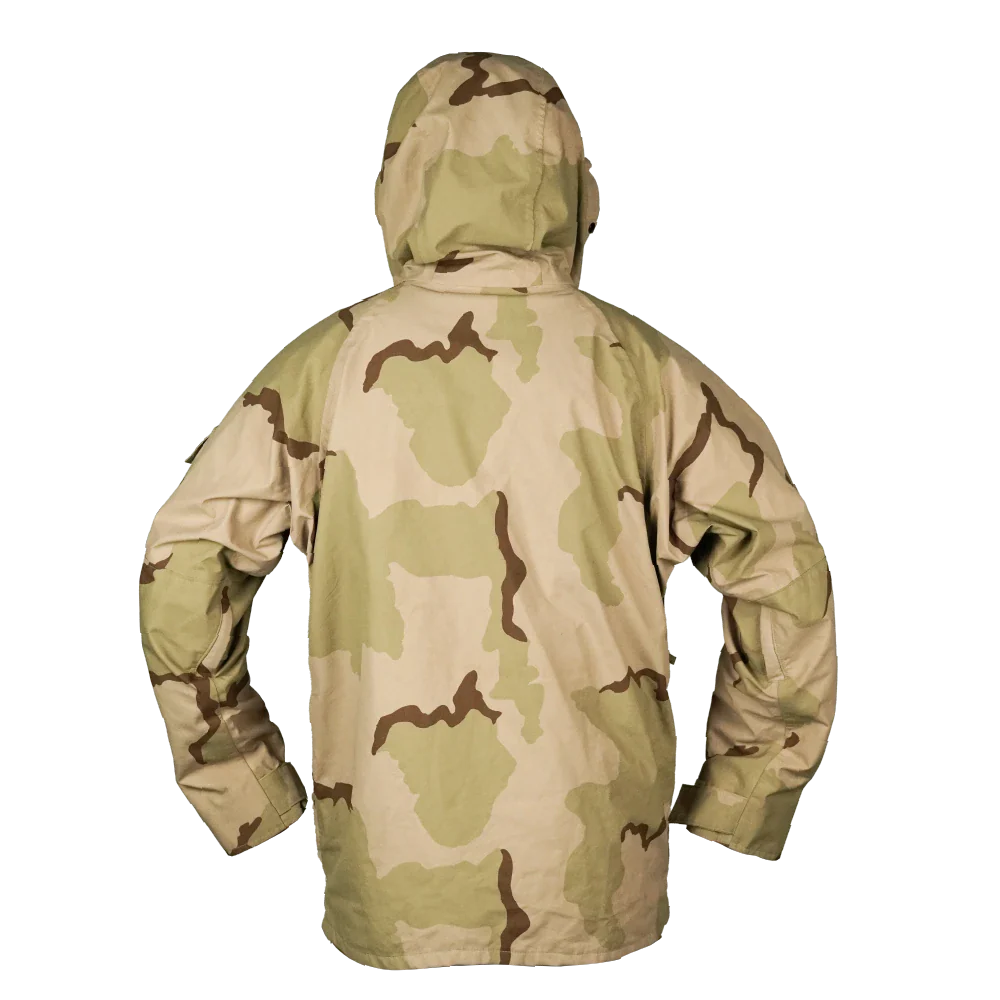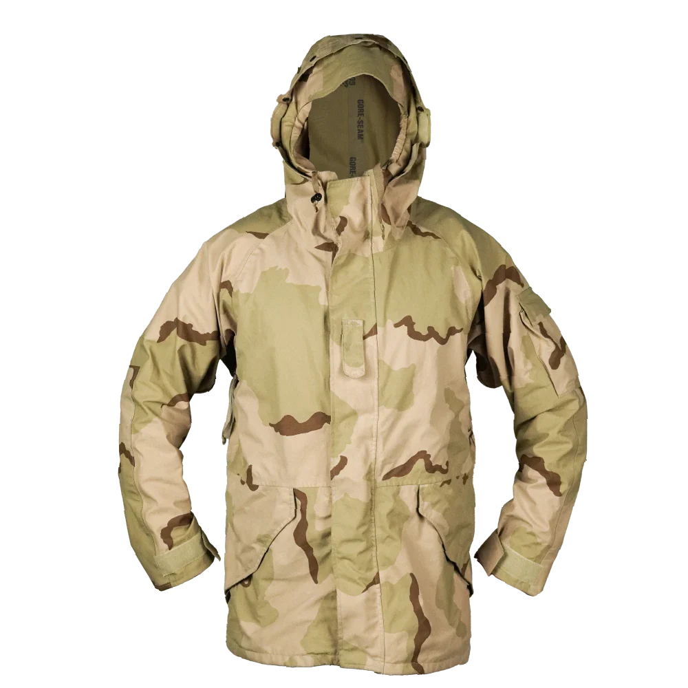 The jacket features an integrated hood, a full front zip with storm protection, and adjustable cuffs. The 3-Colour Desert pattern was standard U.S. issue from the early 1990s through the mid-2000s.