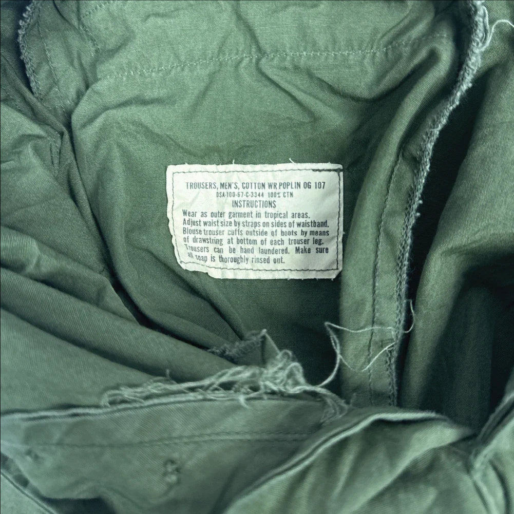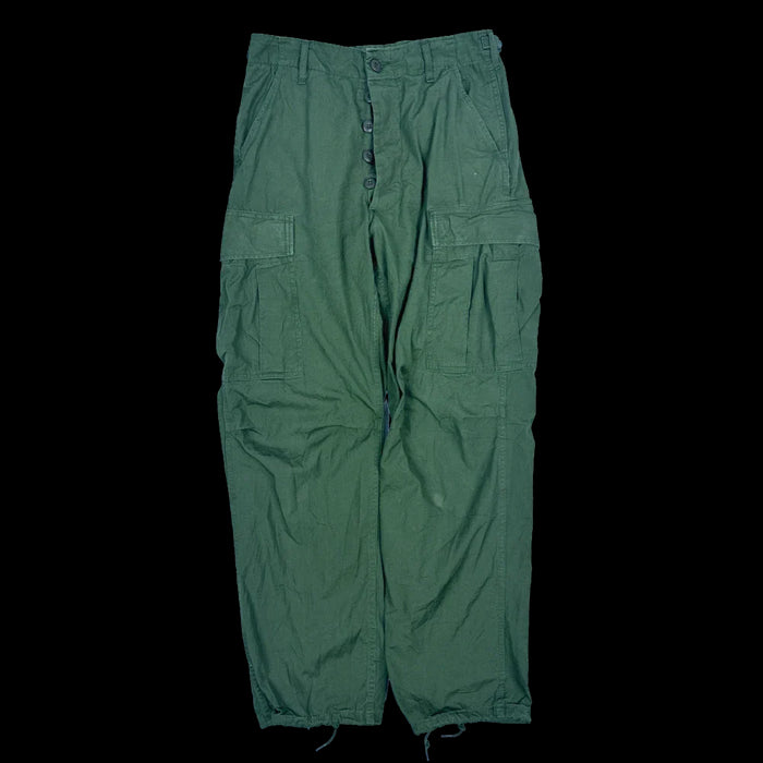 USGI 4th Pattern Jungle Fatigue Trousers in Small Regular. Constructed from non-ripstop poplin cotton fabric. Features two rear button secured pockets and two leg cargo pockets, with adjustable waist straps and draw cords in the leg cuffs. Manufacture date 1967.