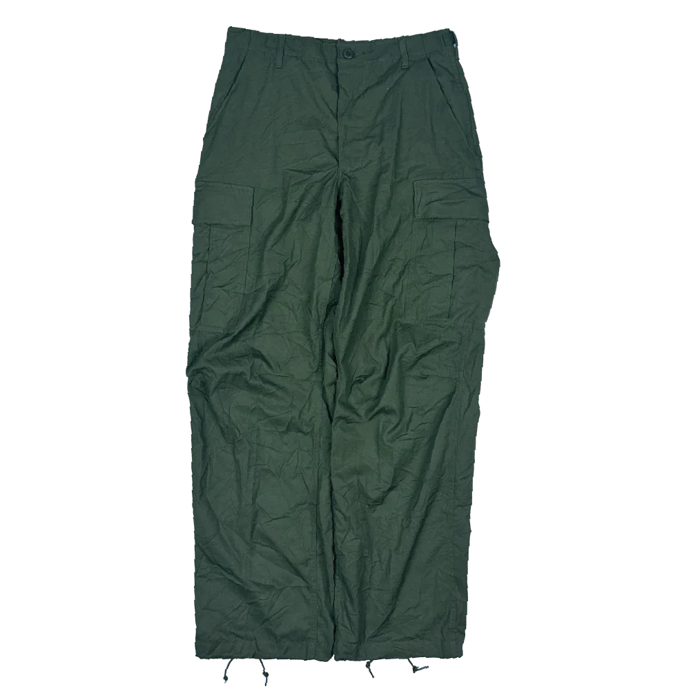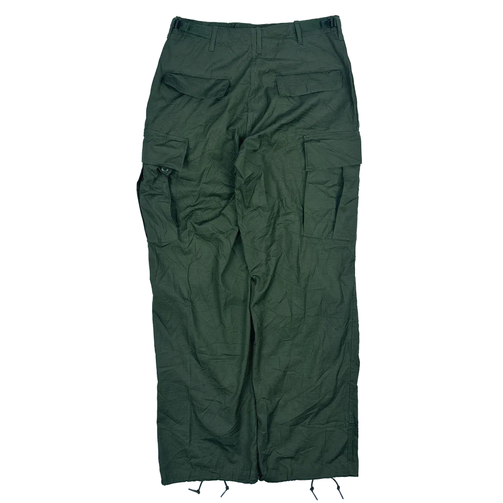 USGI 6th Pattern Jungle Fatigue Trousers manufactured in 1969. Constructed from ripstop poplin cotton fabric with a zip fly closure. Features two rear button secured pockets and two cargo pockets on the legs, with adjustable waist straps and draw cords in the leg cuffs.