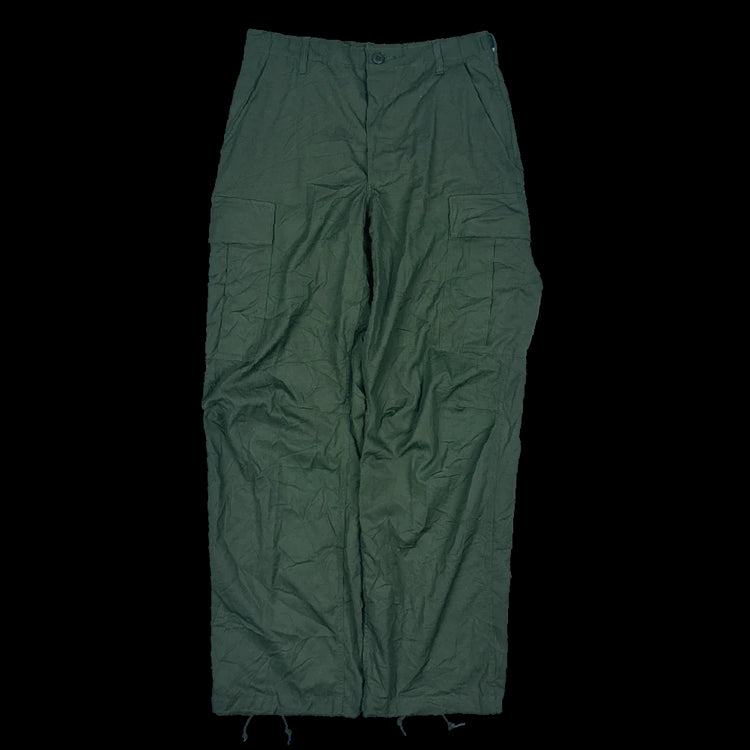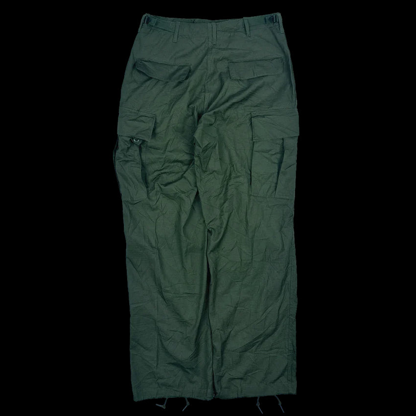 USGI 6th Pattern Jungle Fatigue Trousers manufactured in 1969. Constructed from ripstop poplin cotton fabric with a zip fly closure. Features two rear button secured pockets and two cargo pockets on the legs, with adjustable waist straps and draw cords in the leg cuffs.
