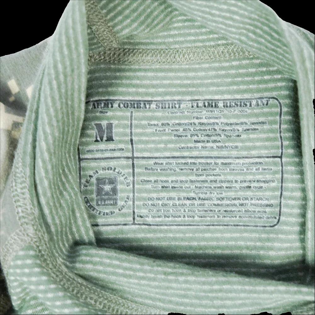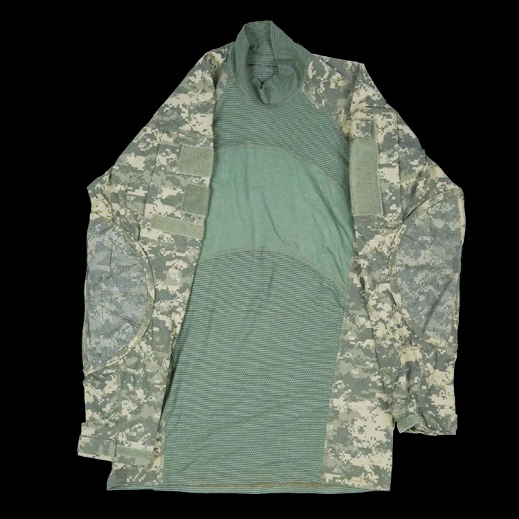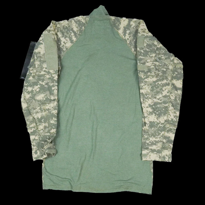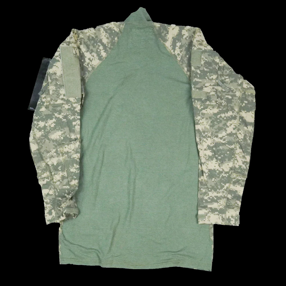 USGI ACU UBAC shirt. Manufacture date 2010 by Massif. Features a moisture-wicking torso with reinforced elbows and zip-closure sleeve pockets.