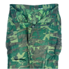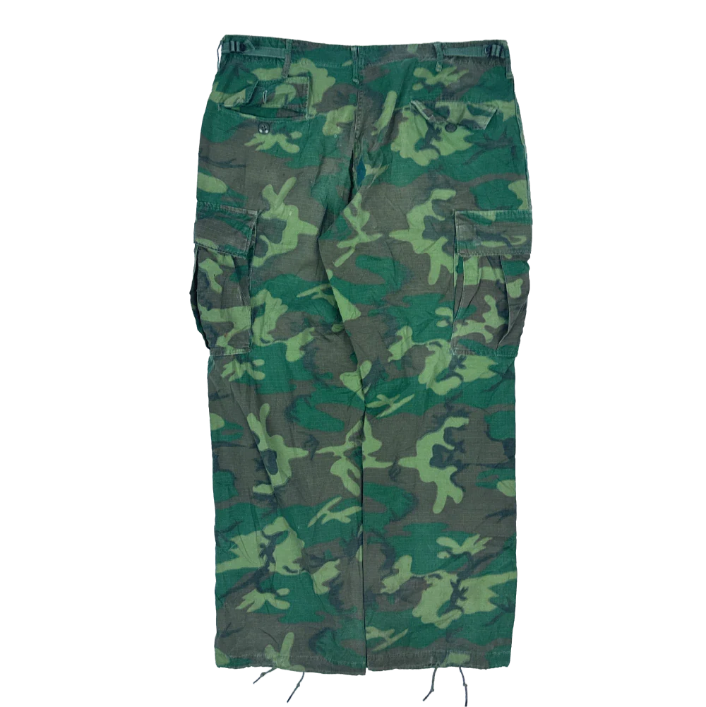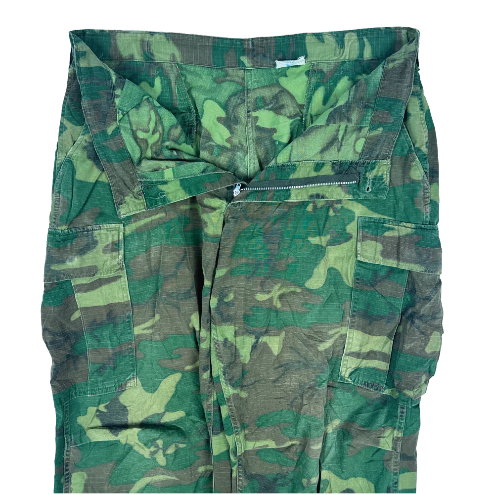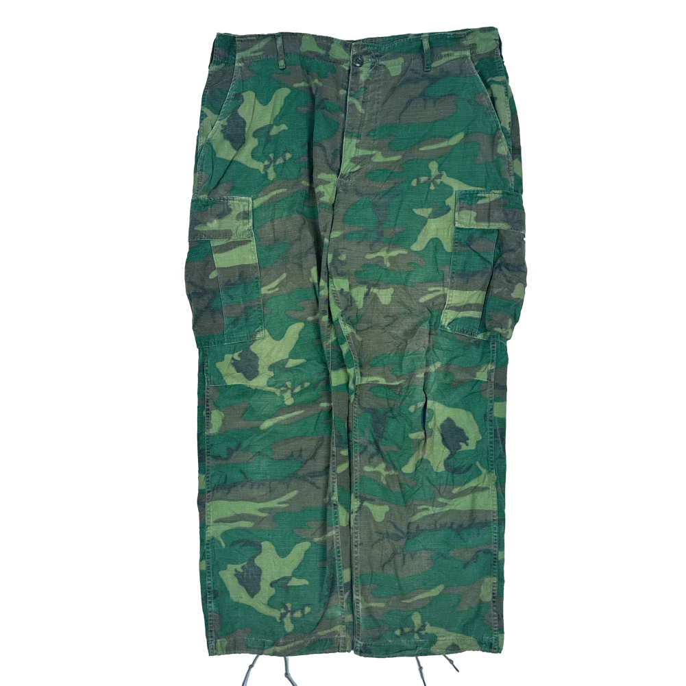 USGI jungle fatigue trousers in ERDL camouflage, identified as the 6th pattern. Constructed from ripstop poplin cotton fabric with a zipper fly. Features include rear and cargo pockets, adjustable waist straps, and draw cords at the leg cuffs. Manufacture date is 1968.