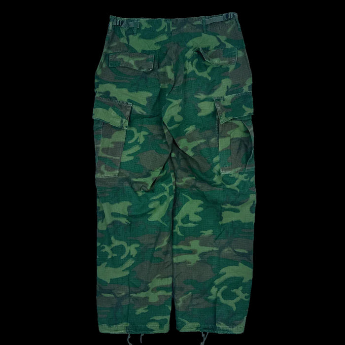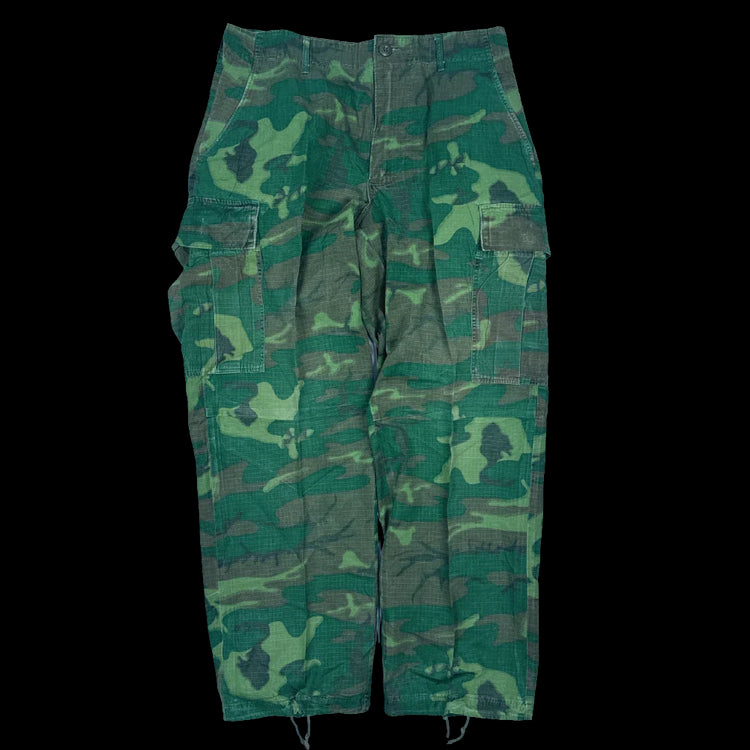 The 6th pattern of the jungle fatigue trousers was the final iteration of the uniform, made in ERDL camouflage. Featuring a zipper fly rather than buttons. Worn primarily by the USMC during the Vietnam War, these also saw use by New Zealand and Australian SAS forces who deployed in South East Asia.