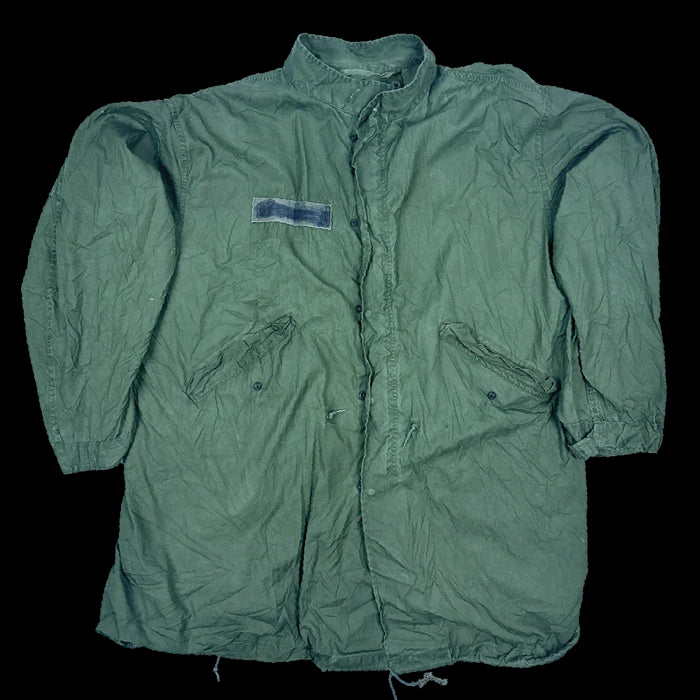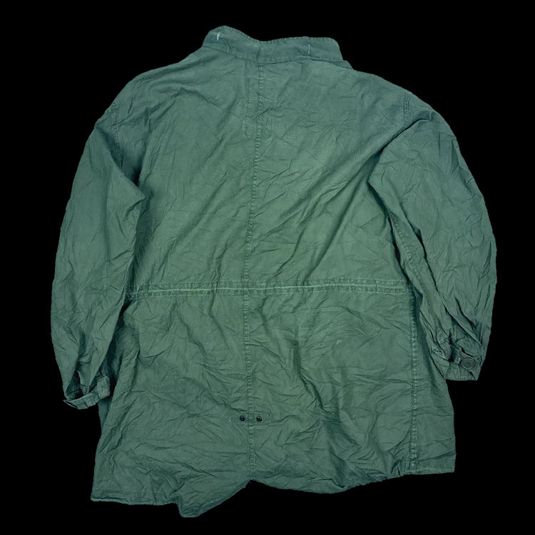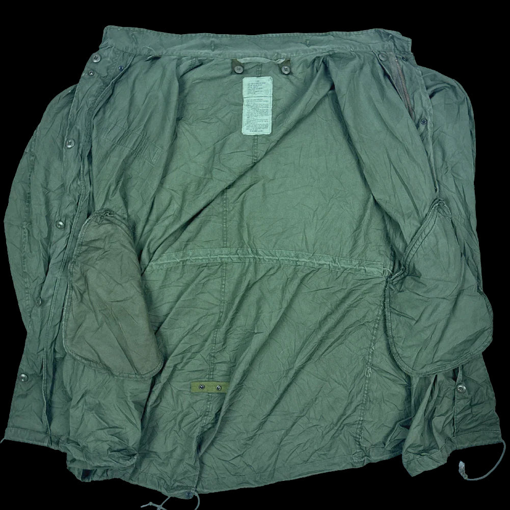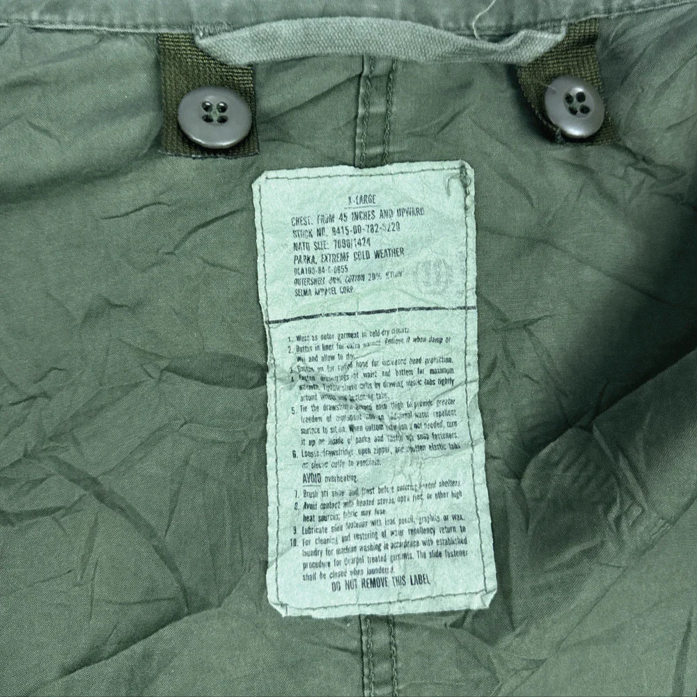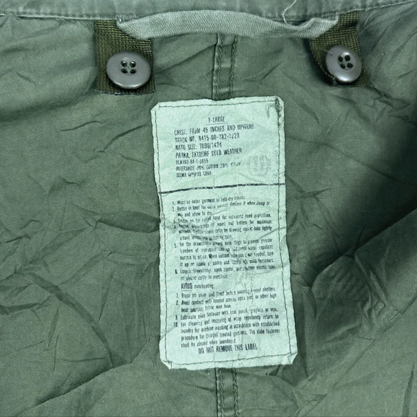USGI extreme cold weather fishtail parka supplied without liner. Manufactured in 1984. The parka includes fleece lined hip pockets with flap closure, internal attachment points for a liner and hood, and drawcord adjustment at the waist and hem.