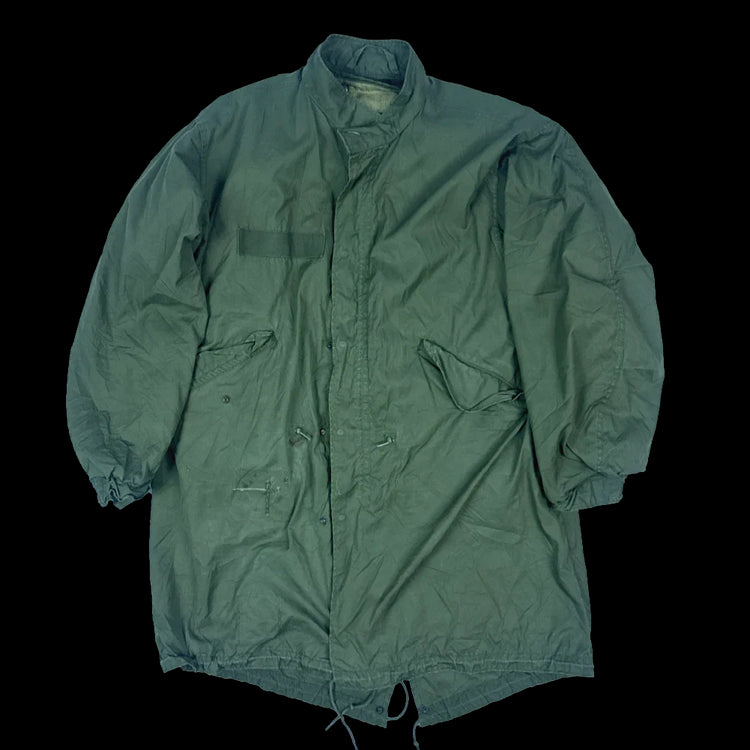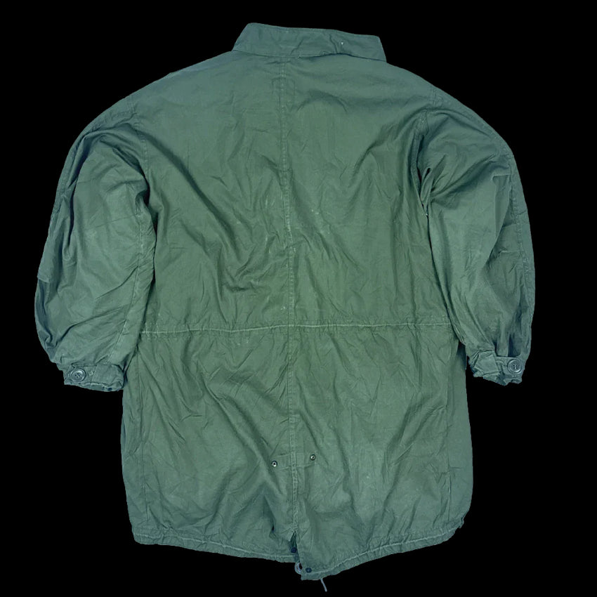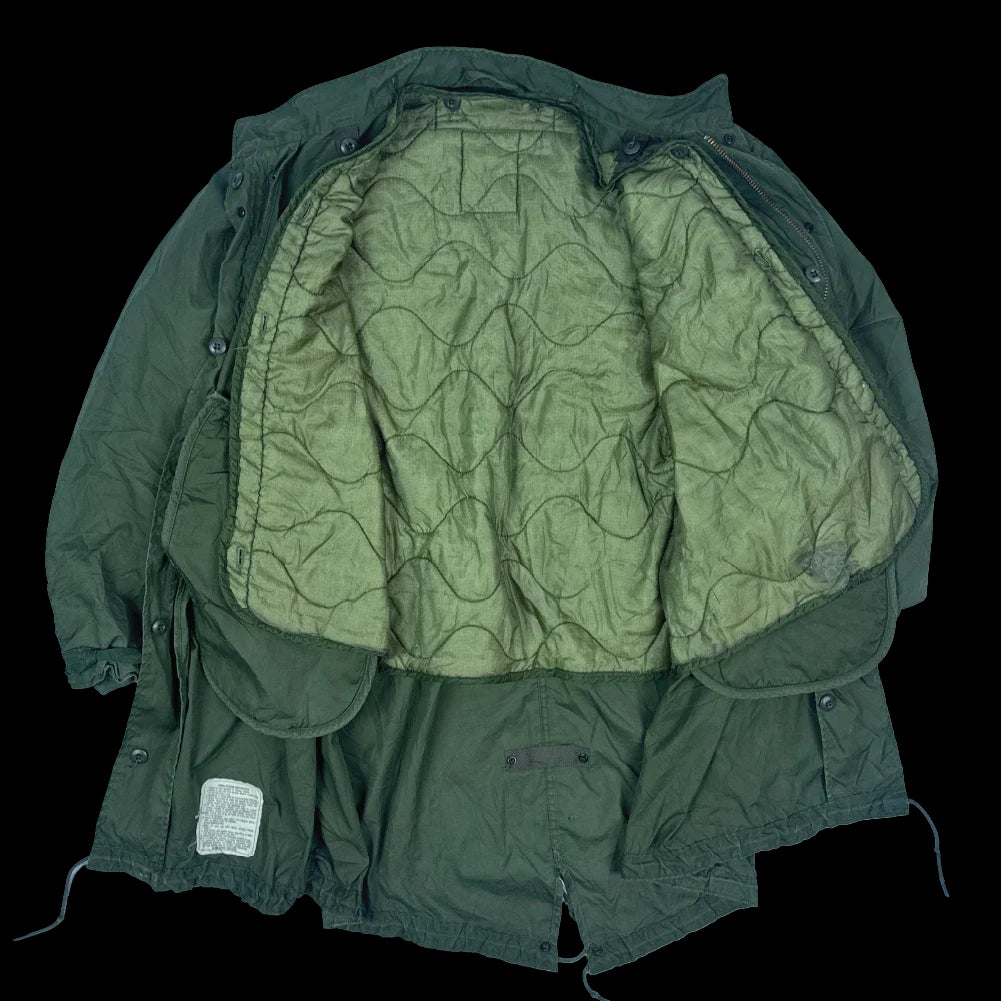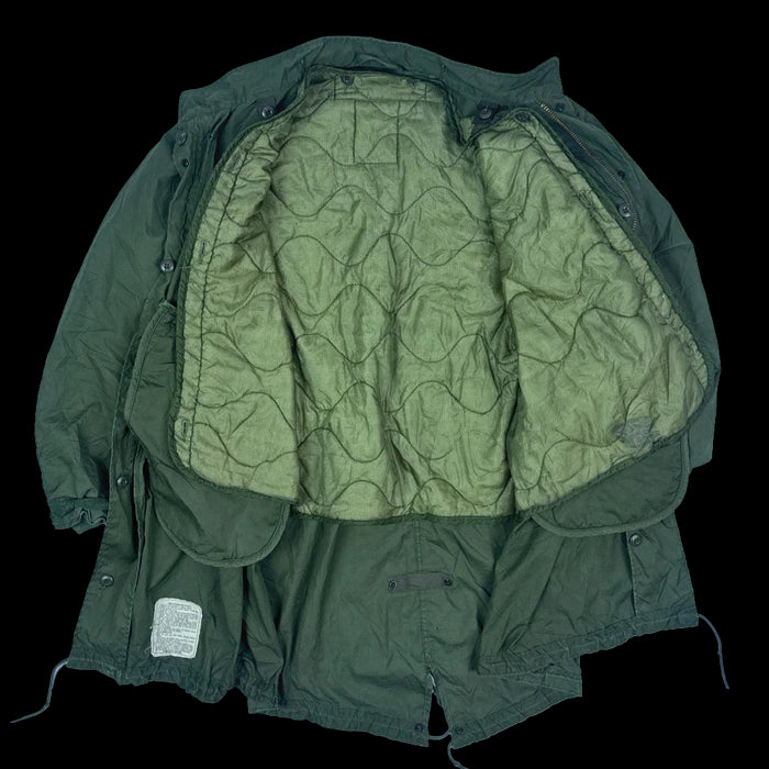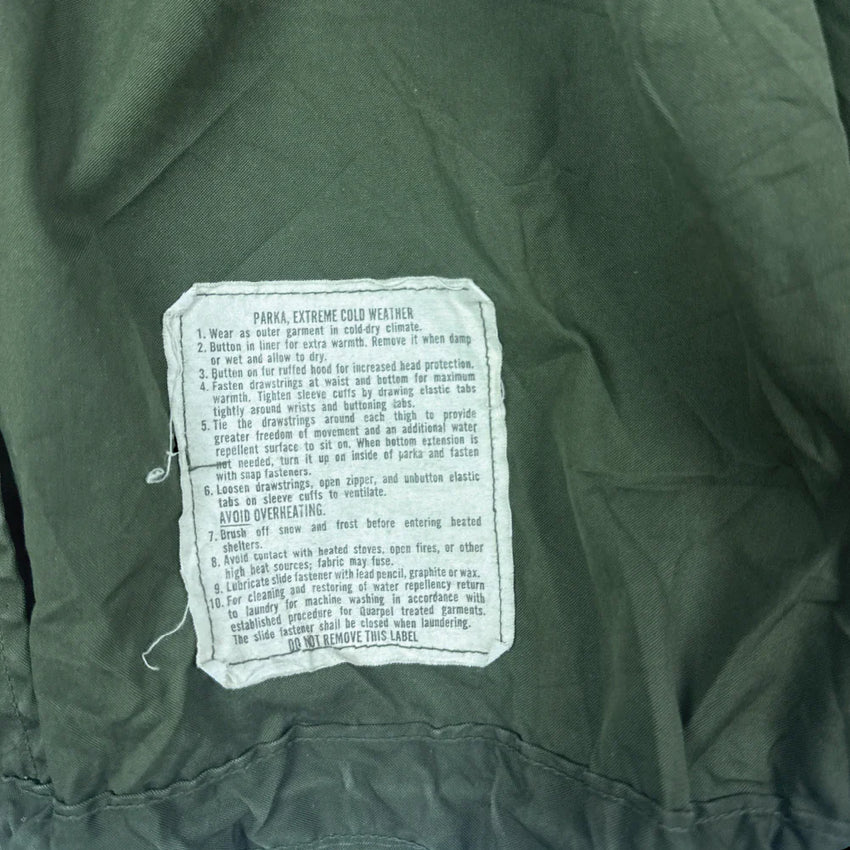 USGI Extreme Cold Weather fishtail parka with detachable M65 field jacket liner. Features fleece-lined hip pockets with flap closure, button attachment points for the liner and hood, and drawcords at the waist and base of the parka.