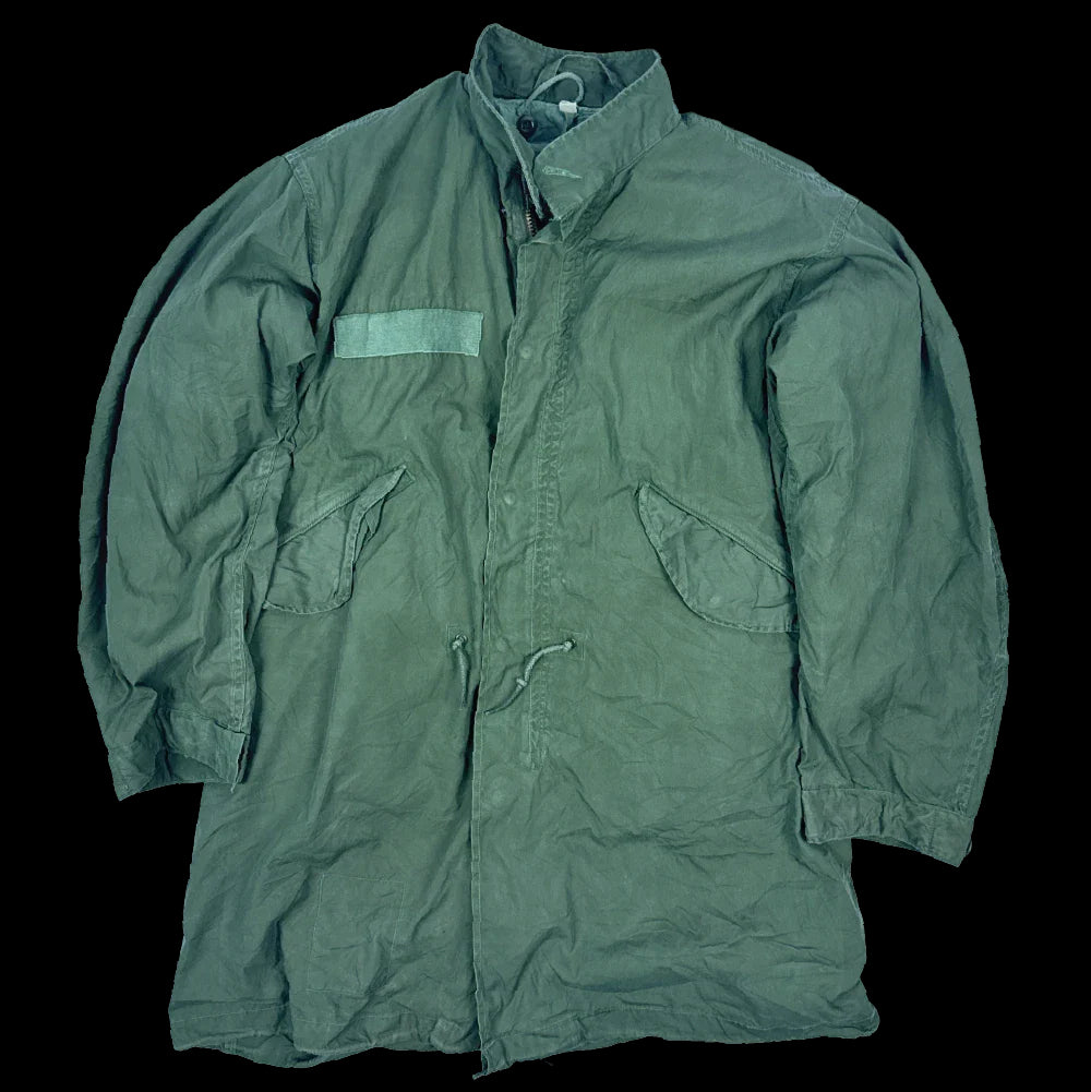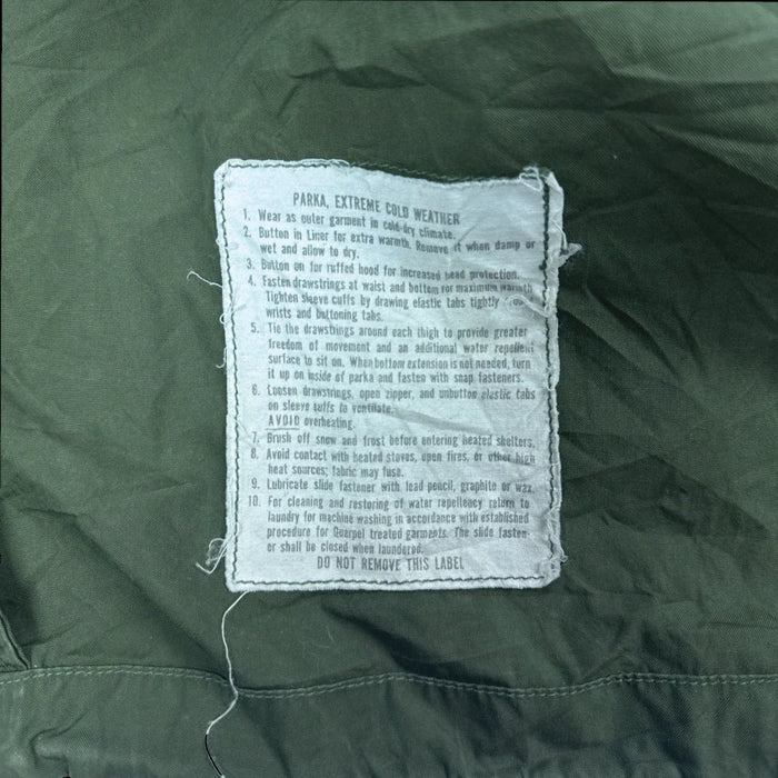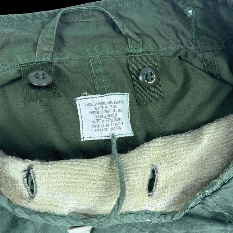 USGI Extreme Cold Weather fishtail parka in size XSmall. Features fleece lined hip pockets with flap closure, drawcords at the waist and base of the parka, and button attachment points for a liner and hood. Manufacture date is 1974.